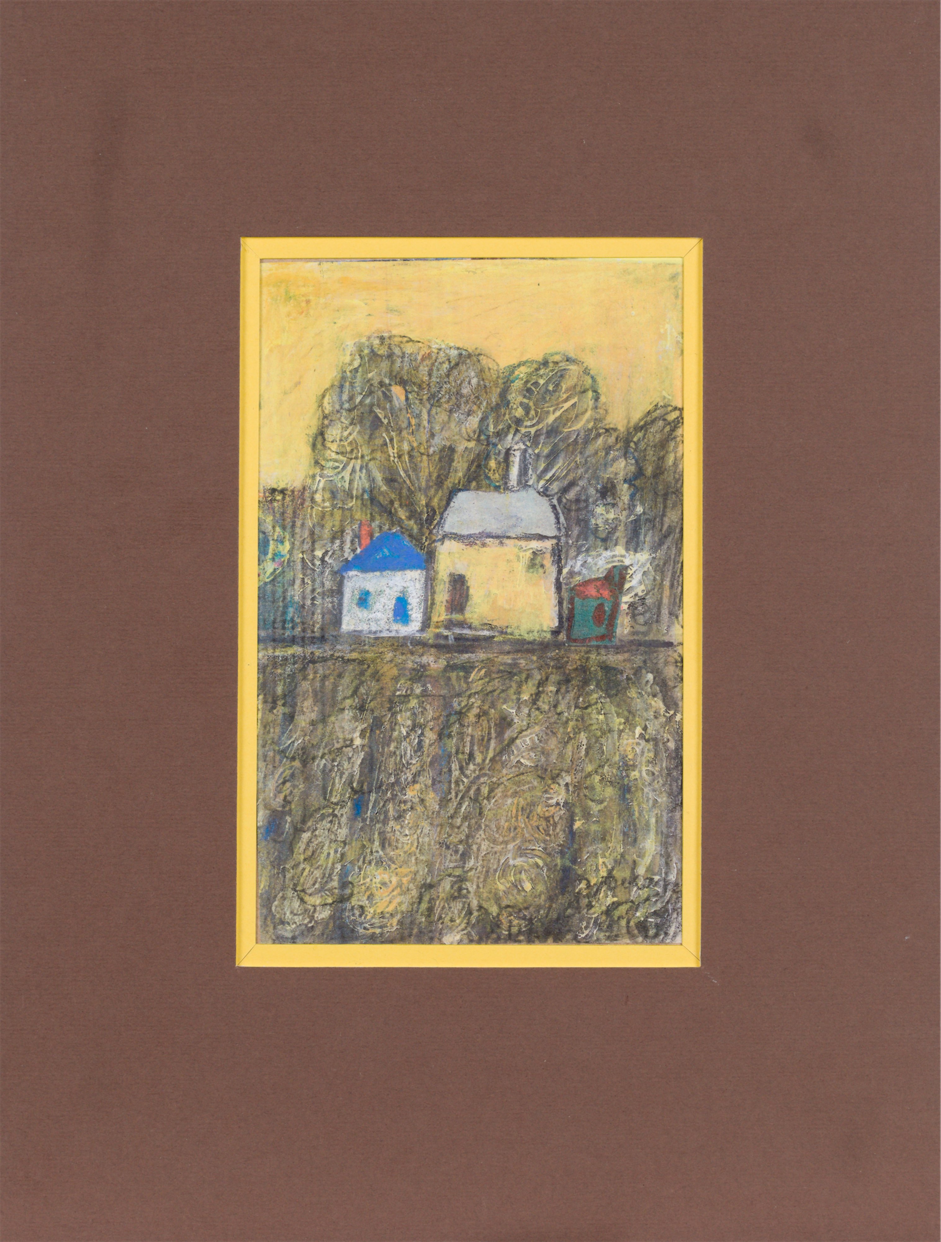 technika mieszana: akryl, akwarela, kredki olejne, papier; 19,9 x 10,4 cm (w św. passe-partout);