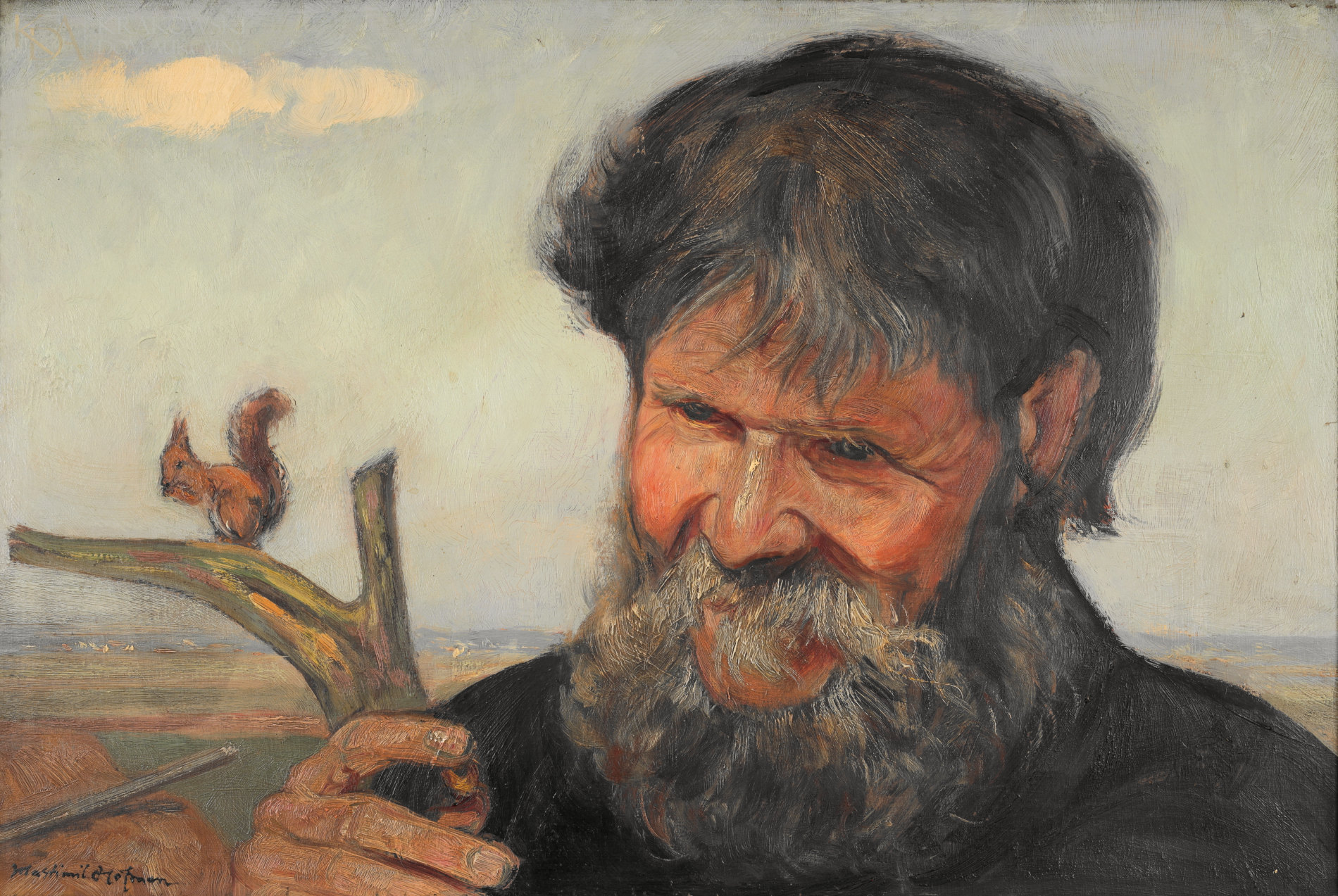 olej, sklejka35,5 x 53 cm; 48,5 x 65,5 cm (z oprawą)Sygn. l.d.: "Wlastimil Hofman"Opisany ołówkiem na odwrocie: "Dziadek z orzechem | Przyjaciel wiewiórek"