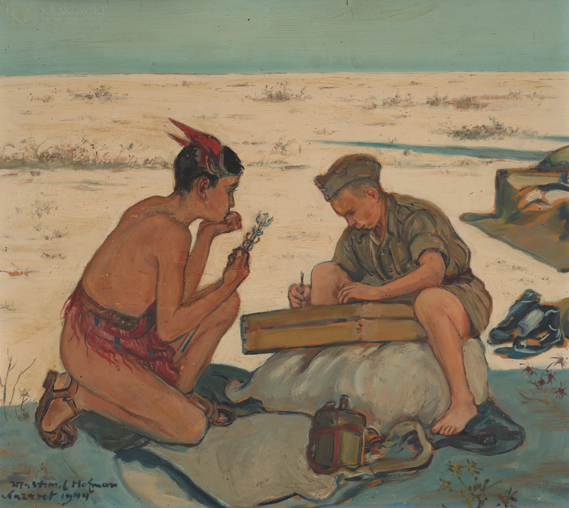 olej, karton35 x 39,8 cm; 51 x 54 cm (z oprawą)Sygn. i opisany l.d.: "Wlastimil Hofman | Nazaret 1944"Opisany ołówkiem na odwrocie: "547) | List do domu | wojsk."