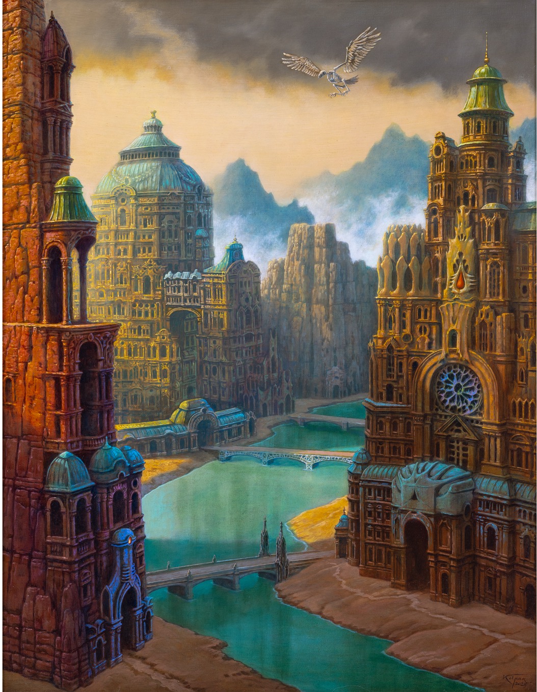 olej, płyta, 90 x 70 cm (w oprawie 108 x 88 cm),sygnowany p.d.: 'Kołpanowicz | 2025' oraz opisany na odwrocie: 'MARCIN KOŁPANOWICZ | "THREE BRIDGES", 2025 | Kołpan | 2025'