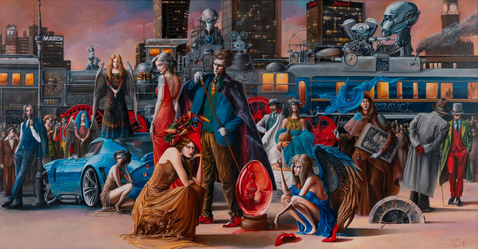 olej, płótno, 90 x 171 cm (w oprawie 126 x 206 cm),sygnowany p.d.: '2025 | Osipoff' oraz opisany na odwrocie: 'Osipoff | 2025 | z serii "MIASTA" | 2025 | Oleg Osipoff | "WARSZAWA" | CM. 90 x 170 | oil ON CANVAS'