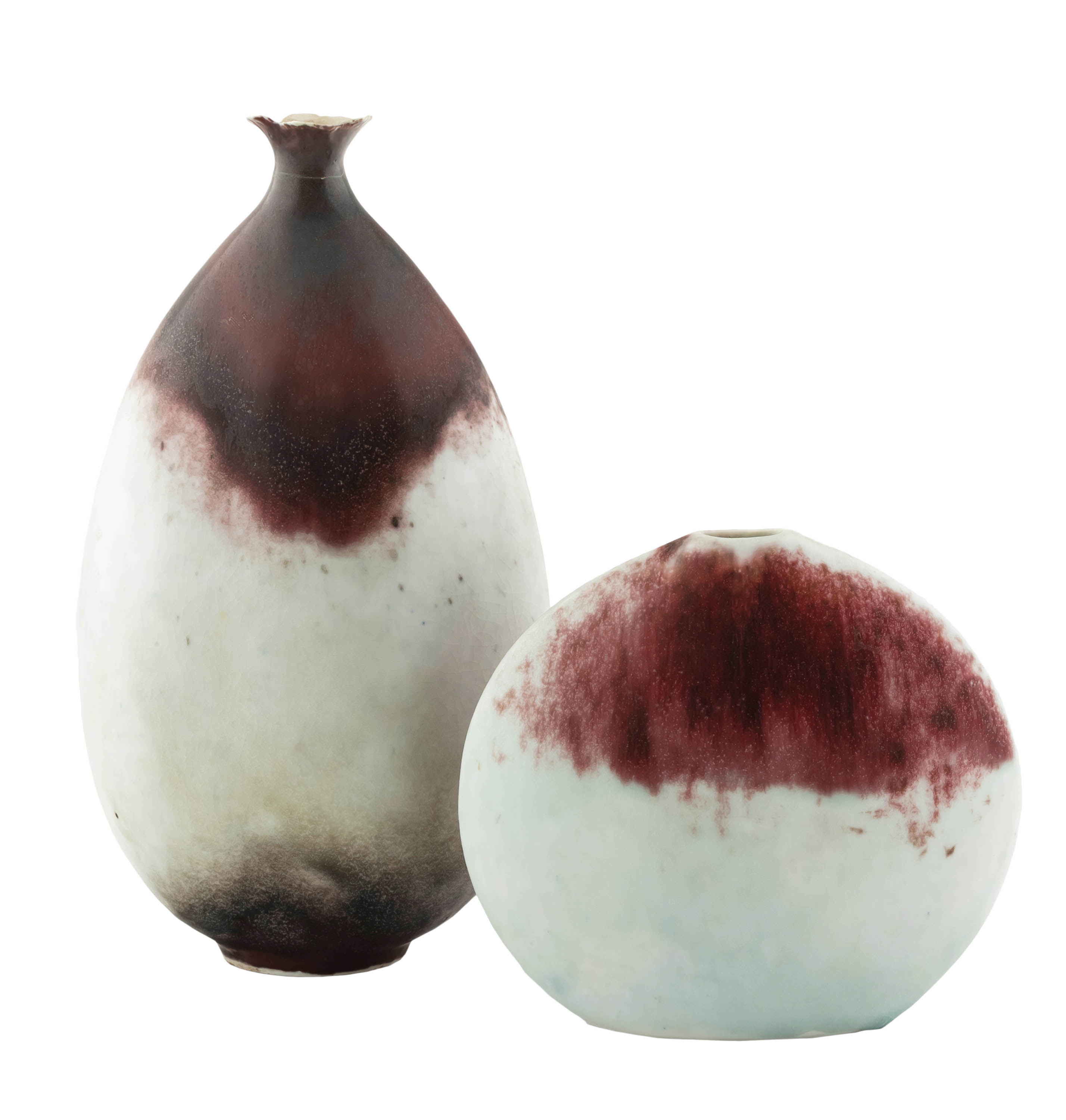 porcelana, autorskie szkliwo, wymiary mniejszego wazonu: wys. 14,5 cm, szerokość 15 cm, wymiary większego wazonu: wys. 24,5 cm, szerokość 14 cm,