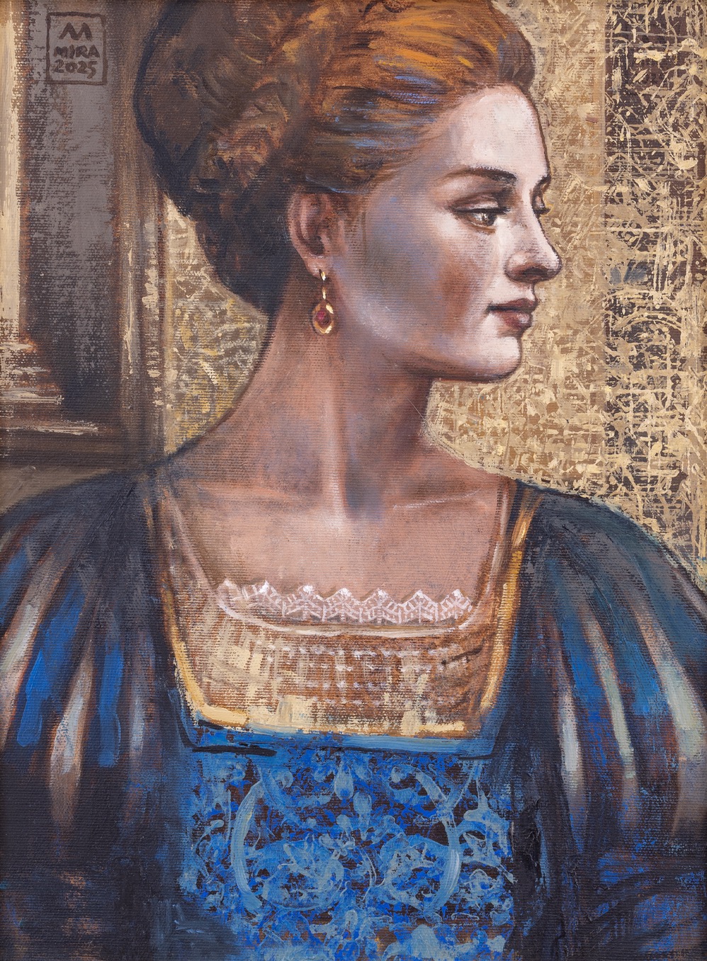 olej, płótno, 40 x 30 cm (w oprawie 58 x 48 cm),sygnowany l.g.: '[monogram M] | MIRA | 2025' oraz opisany na odwrocie: 'RENESANSOWA SUKIENKA | 40 x 30 cm, OLEJ, 2025 | MIRA SKOCZEK-WOJNICKA | Mira'25'