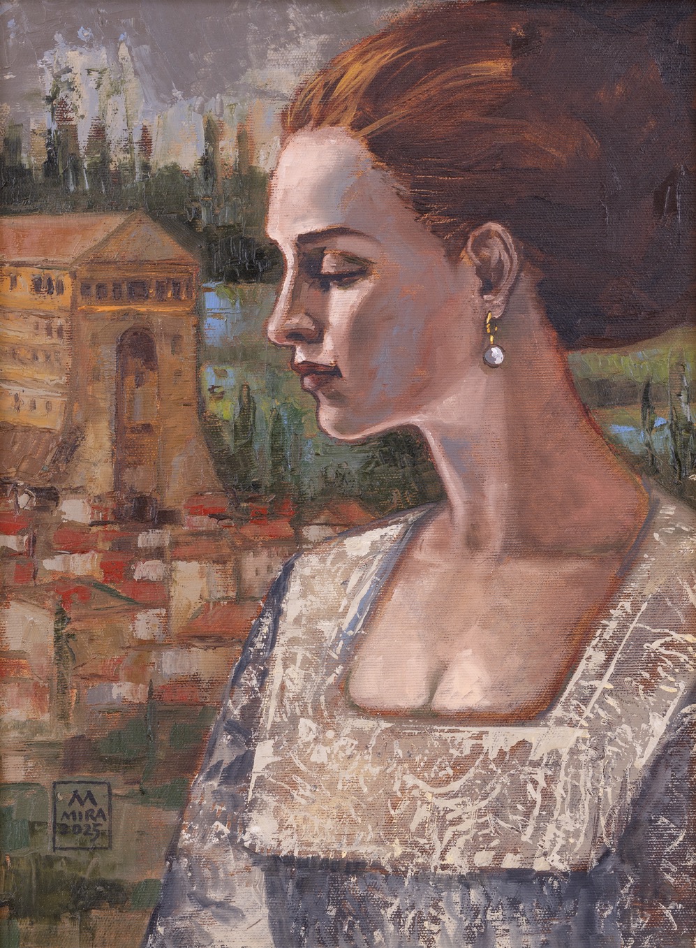 olej, płótno, 40 x 30 cm (w oprawie 58 x 48 cm),sygnowany l.d.: '[monogram M] | MIRA | 2025' oraz opisany na odwrocie: 'WIZYTA W URBINO | 40 x 30 cm, OLEJ, 2025 | MIRA SKOCZEK-WOJNICKA | Mira'25'