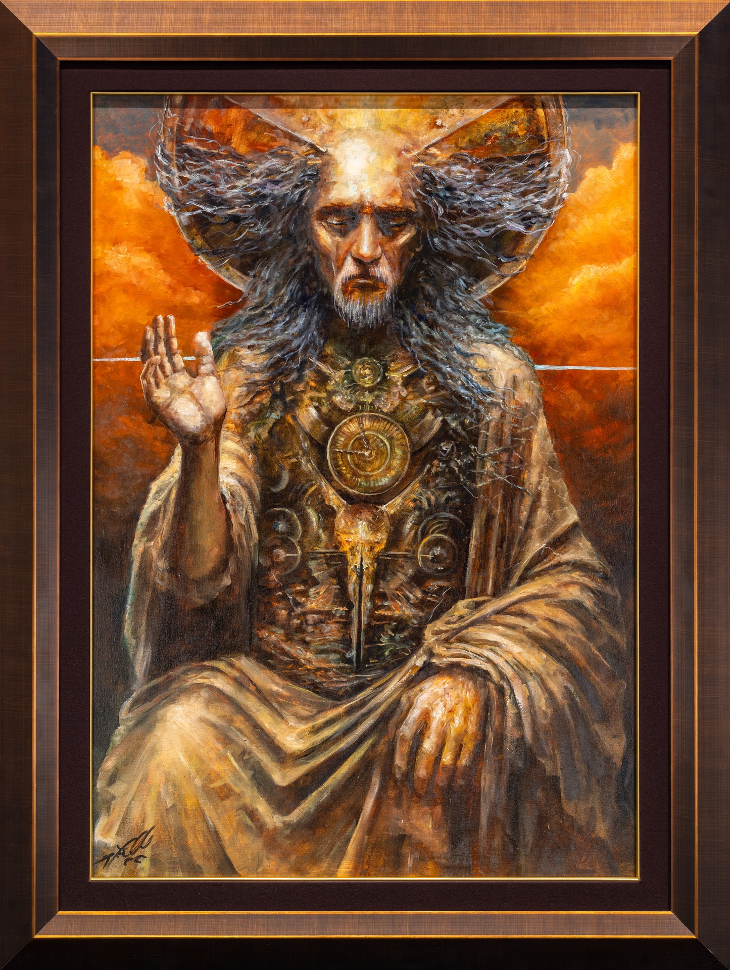 olej, płyta, 108 x 77,5 cm (w oprawie 123 x 94 cm),sygnowany l.d.:'PJakub | 25' oraz opisany na odwrocie: 'PIOTR JAKUBCZAK | "ZEGARMISTRZ" | 2025 | olej na płótnie płycie'