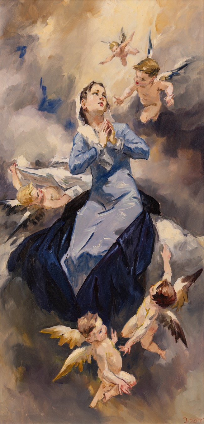 olej, płótno, 80 x 40 cm (w oprawie 107 x 67 cm),sygnowany p.d.:'JSZPYT' oraz opisany na odwrocie: 'Janusz Szpyt | "MADONNA Z ANIOŁKAMI" | 2021 | 80 x 40'