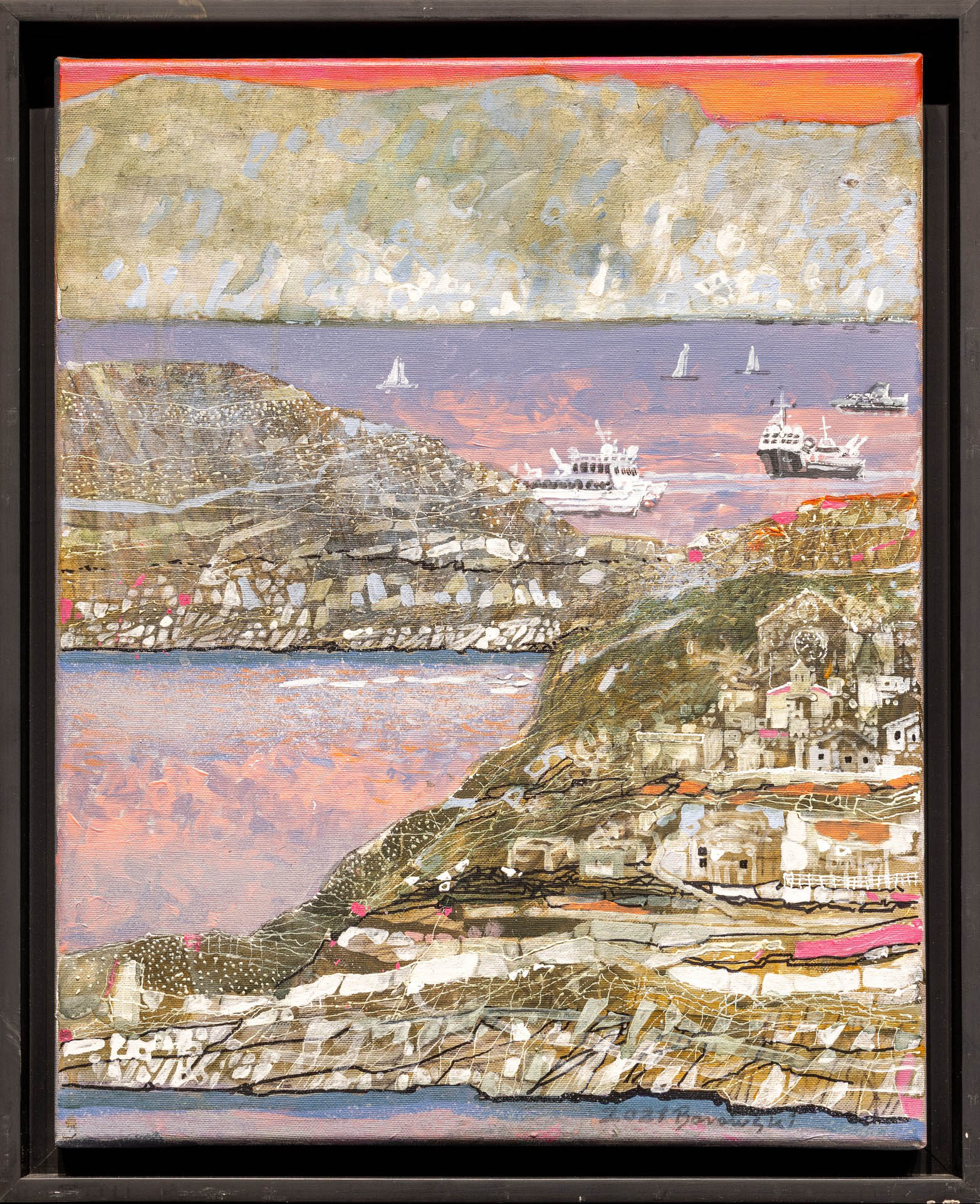 akryl, technika własna, płótno, 51 x 39,5 cm (w oprawie 56 x 45,5 cm),sygnowany p.d.: '2021 Borowski' oraz opisany na odwrocie: 'rysunek artysty | "Podróż do Livorno I" | Aborowski 2021 | akryl, technika własna | płótno'