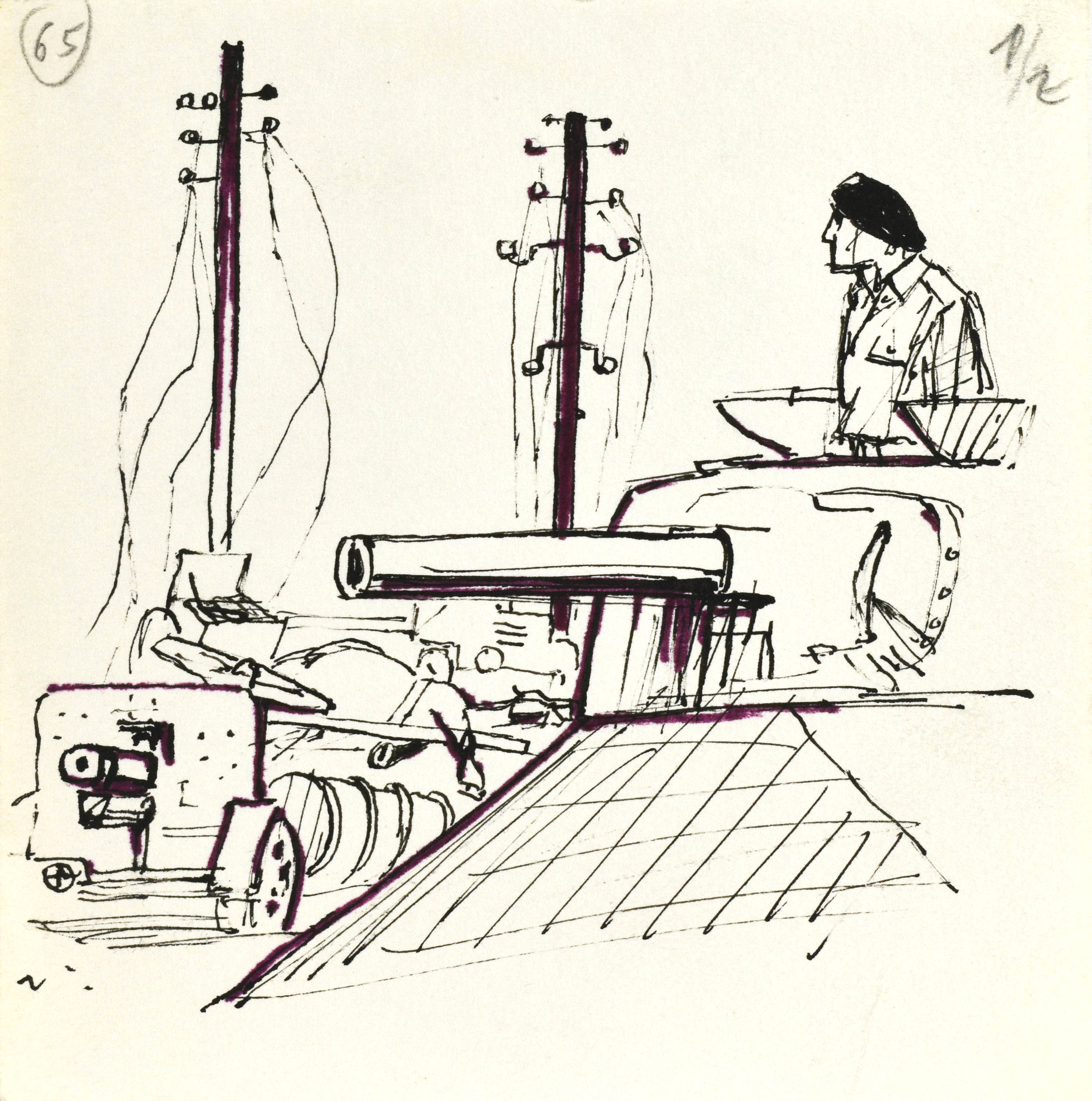 piórko, tusz, flamaster, papier; 14 x 13,7 cm.