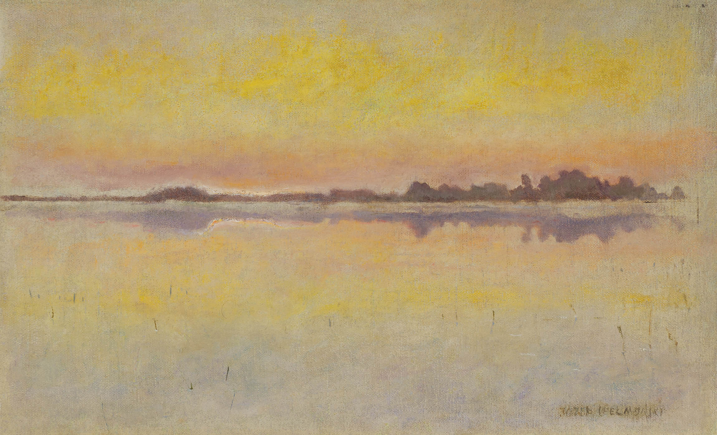 Omawiane dzieło jest znakomitym przykładem fascynacji Chełmońskiego płaskim mazowieckim pejzażem. Zdałoby się, prozaicznym motywem wąskiego pasma wiejskiego krajobrazu ożywionego partiami zgrupowanych drzew. Pejzaż tworzy cienką linię horyzontu, dzielącą kompozycję na dwa niemal równe człony. Na przestrzeń nieba i przestrzeń ziemi, w naszym przypadku wody. Nad nią dominująca połać budzącego się nieba. To ulubiony motyw Chełmońskiego. Blado oranżowa jutrzenka poprzetykana delikatnymi pasmami fioletu i siwą mgiełką nad linią horyzontu. Linia horyzontu odbija się w tafli wody i tutaj odbicie żółcieni nieba jest delikatnym woalem. Podobnie jak subtelne oranże, fiolety, zgaszone biele i delikatny błękit wody. Syntetyzm ujęcia pasma krajobrazu na horyzoncie jest w pełni godny mistrza. Malarska wizja artysty nadaje dziełu wymiaru poetycznej nostalgii. Wiadomo, z zachowanych wspomnień o malarzu, że można go było często spotkać gdzieś wśród pól i łąk, najczęściej o wczesnej porze wschodu dnia lub o zmierzchu opromienionego zachodzącym słońcem.