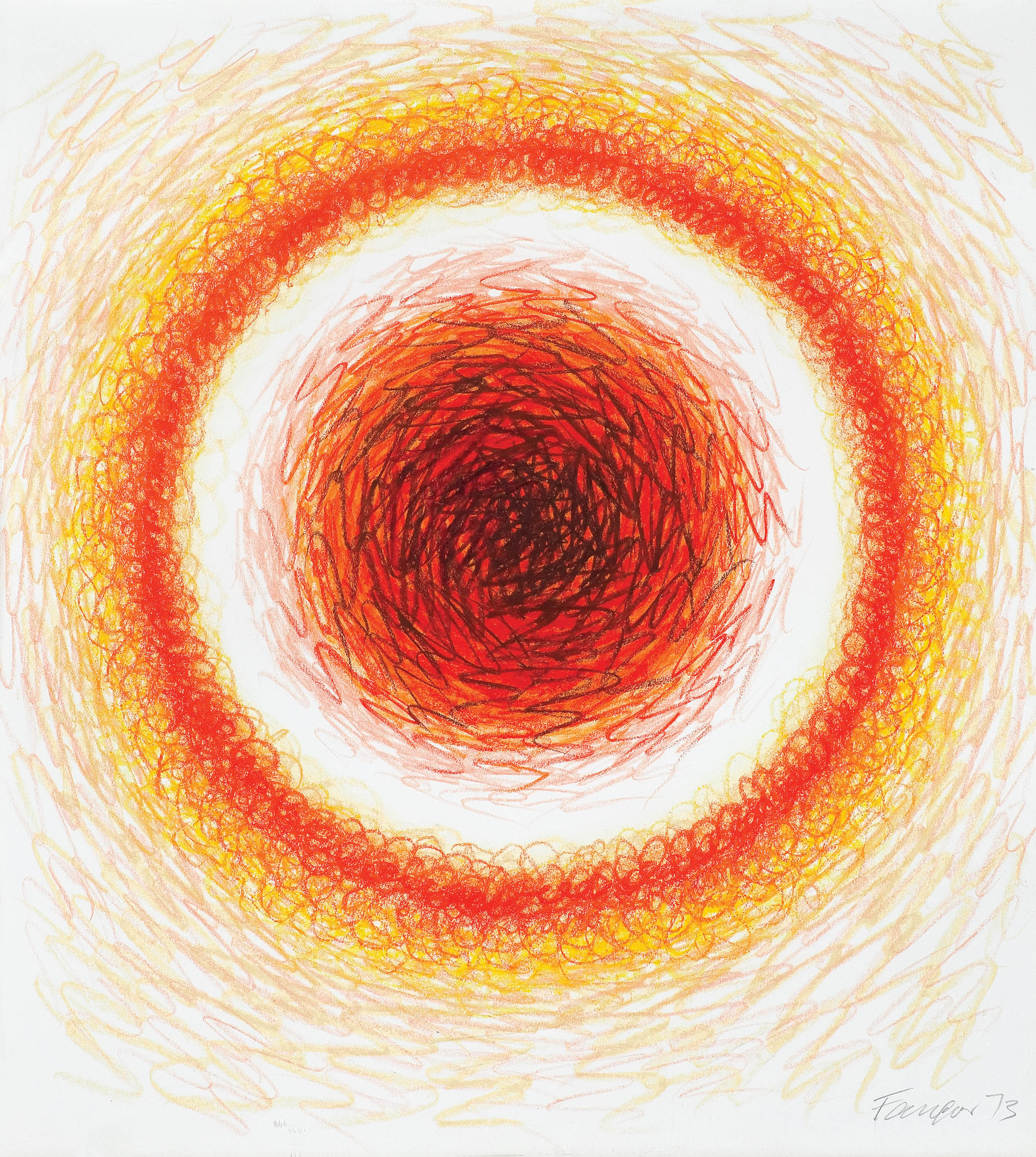 Rysunkowe odpowiedniki obrazów, wykonywane kredkami, określane zbiorczym tytułem Koła (w przeciwieństwie do obrazów, z których każdy opatrzony jest symbolem literowym i unikalnym numerem) towarzyszyły malarstwu Fangora jako autonomiczne dzieła, nie szkice czy próby do konkretnych obrazów. Efekt zamglenia i wibracji kolorów nie był, jak się wydaje, celem artysty, choć nerwowy, szarpany dukt kreski i zazębianie się barw, a także różnice walorowe mogą to sugerować. Z prac tych jednak emanuje przede wszystkim przyjemność, radość z kolorów i samej czynności rysowania. Takie właśnie, hedonistyczne podłoże ogromnej rysunkowej spuścizny Fangora – nie tylko abstrakcyjnej, również figuratywnej – odsuwa na plan dalszy myśli o formie, koncepcji, programie, stawiając wyżej estetykę, której służy nieomylna ręka.