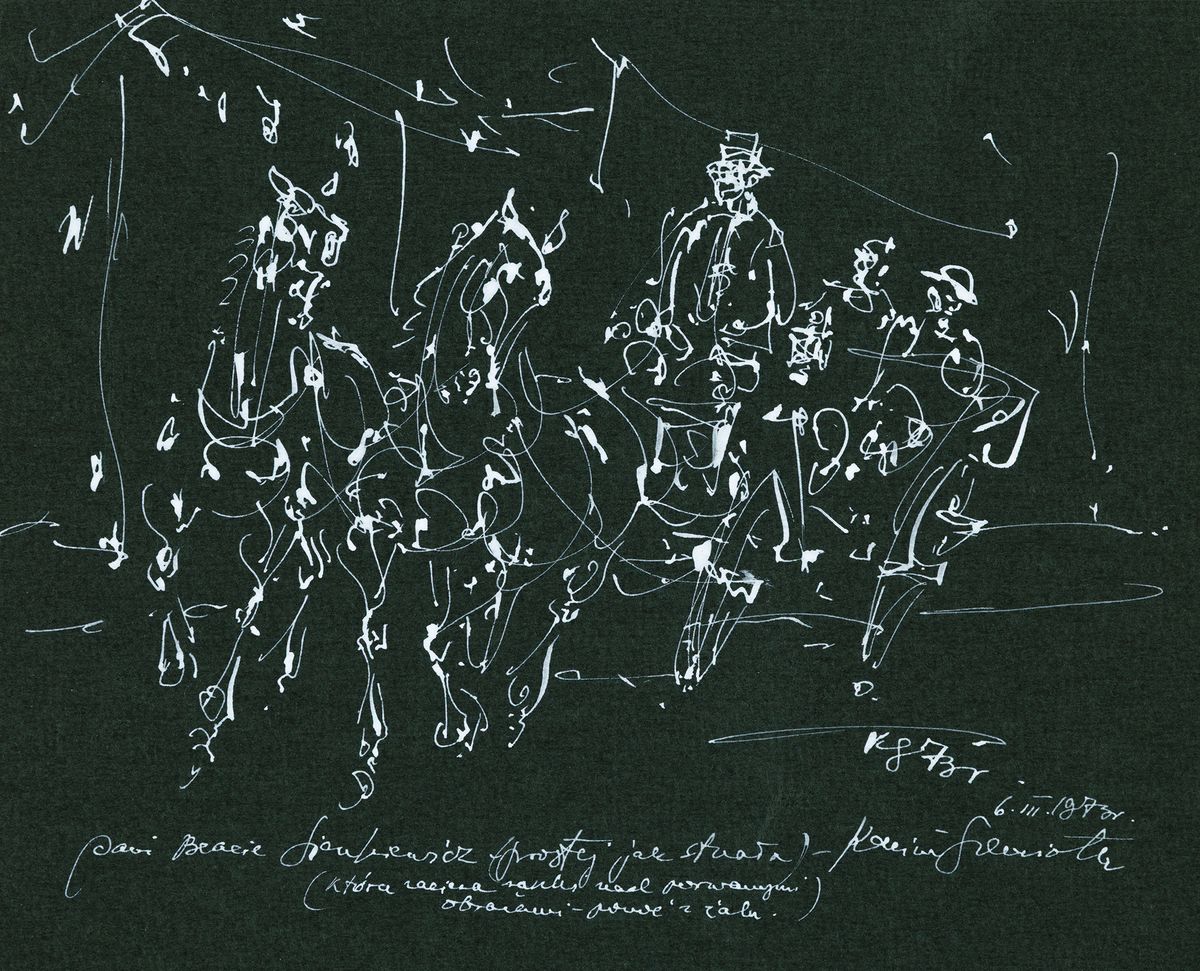 2 – biały tusz, piórko na barwnym papierze, jeden za zielonym sygnowany KS73, drugi na brązowym: 7 III / 1973 / Panu Andrzejowi, który mi o mały włos reki nie złamał Kazimierz Szemiot