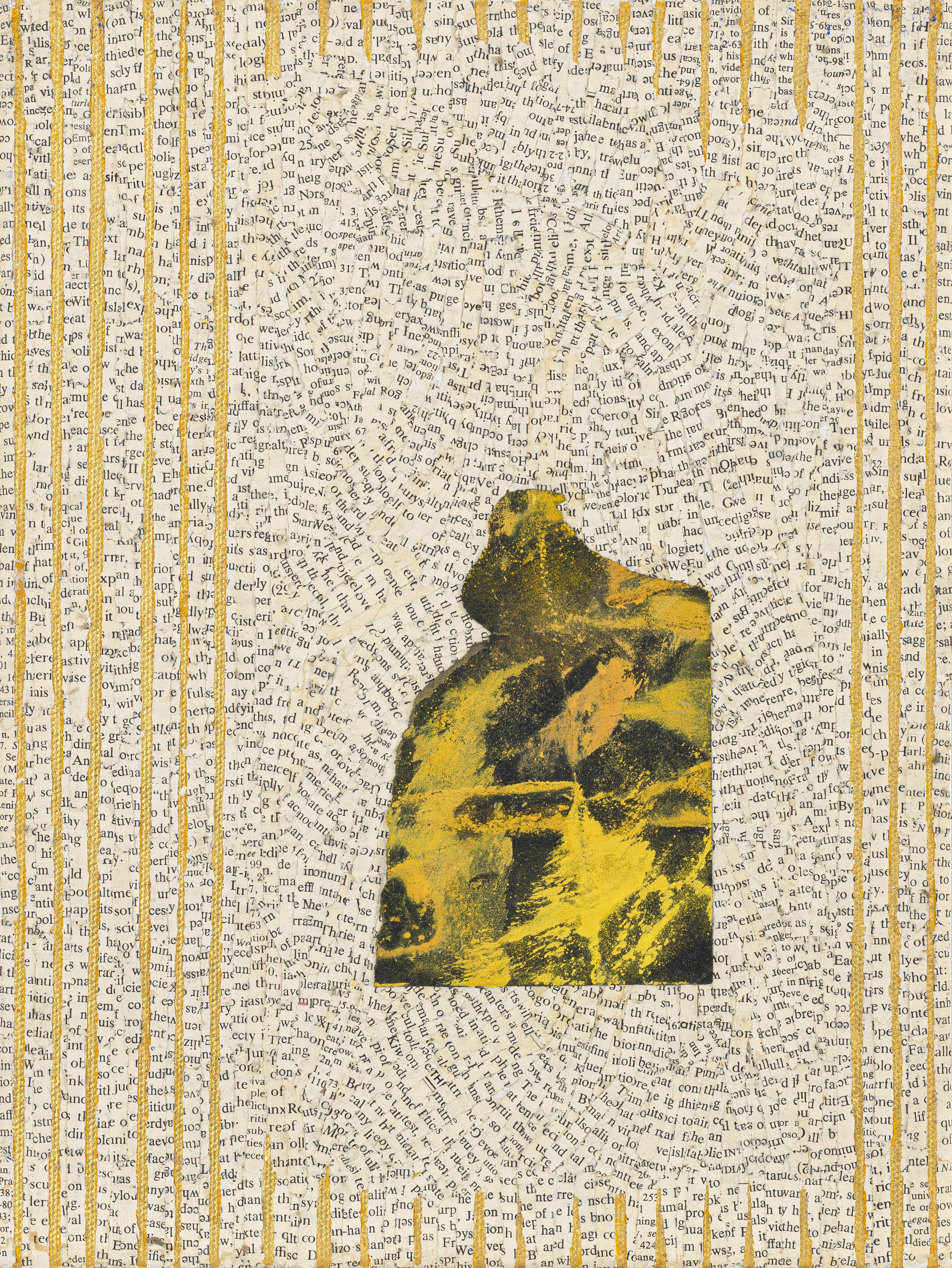akryl, papier ścierny, strona książki, złoto płatkowe/płótno, 30,5 x 23 cm,