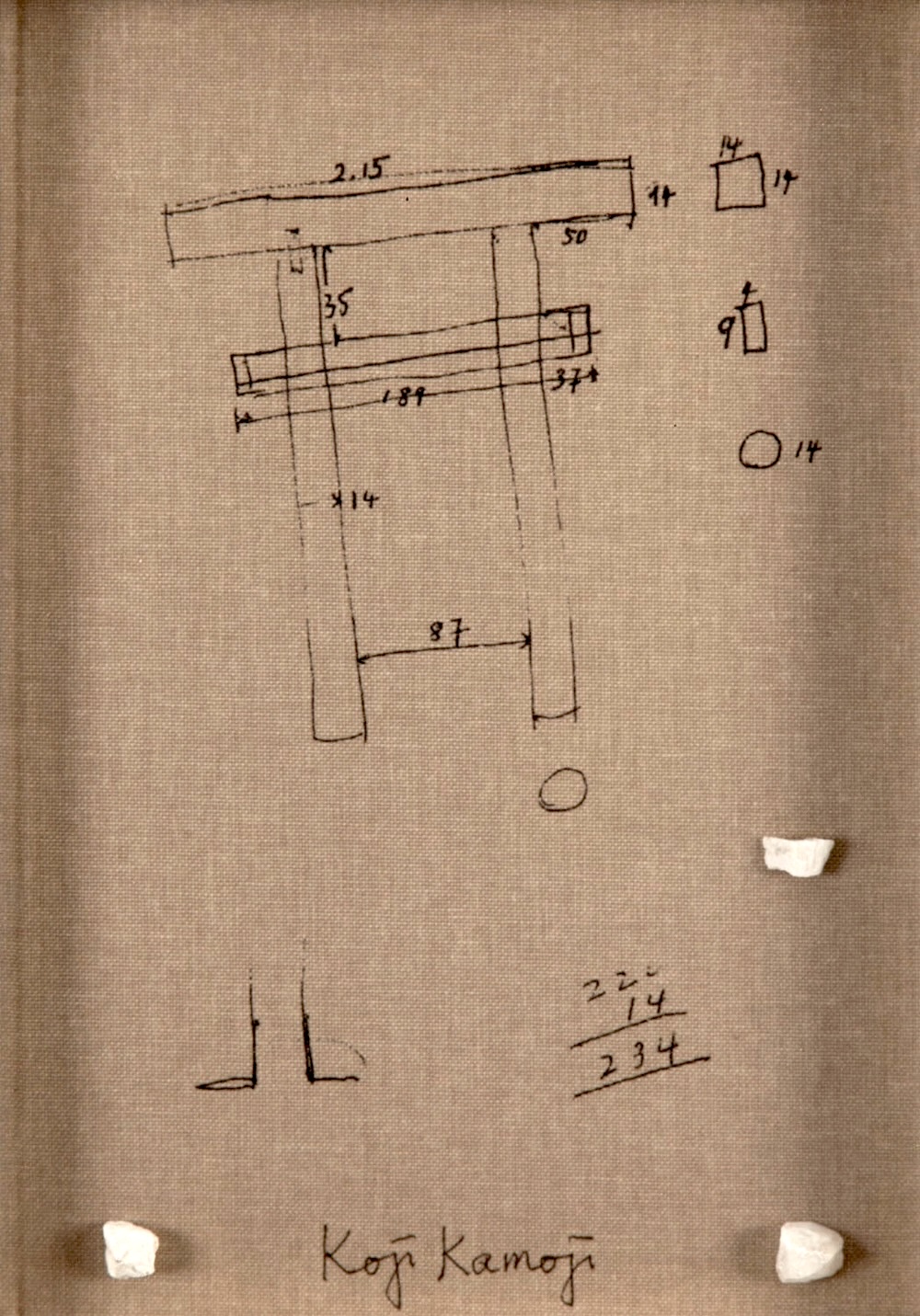 Na lnianym płótnie okładki katalogu wystawy Kamojiego z 2016 roku artysta narysował szkic konstrukcyjny z wymiarami, najprawdopodobniej projekt torii, tradycyjnej japońskiej bramy świątynnej. Widać charakterystyczny układ: pozioma belka górna (2,15 m), poprzeczki, dwa pionowe słupy (rozstaw 87 cm), kamień u dołu. Obliczenia w prawym dolnym rogu (220+14=234) wyglądają jak sumowanie elementów konstrukcji.