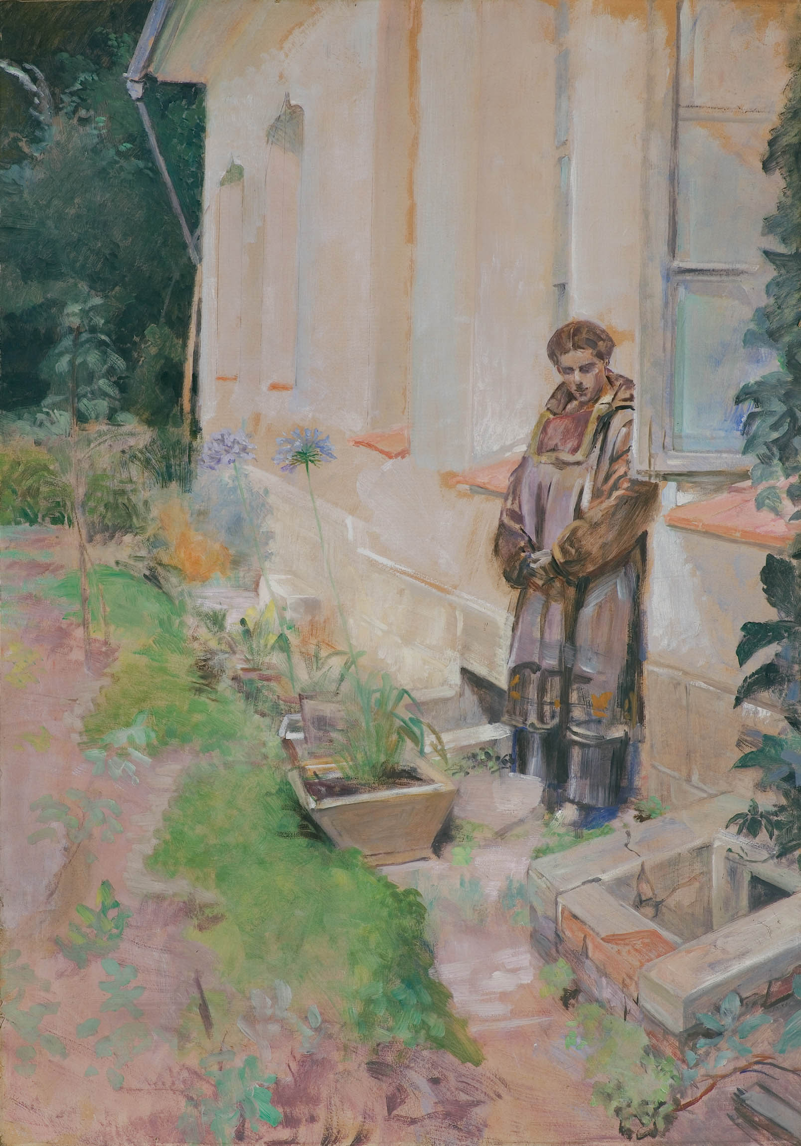 Oferowane dzieło mogłoby być kolejną sekwencją tej sceny. Znów widzimy ścianę dworu, ale już z dalszej perspektywy. Na pierwszym planie widnieje oświetlony promieniami letniego słońca fragment ogrodu z kwitnącymi agapantami - kwiatami symbolizującymi miłość i piękno. Pod otwartym oknem widzimy tę samą postać – geniusz śmierci stoi tu pogrążony w ciszy, jaka towarzyszy spokojnemu odchodzeniu.