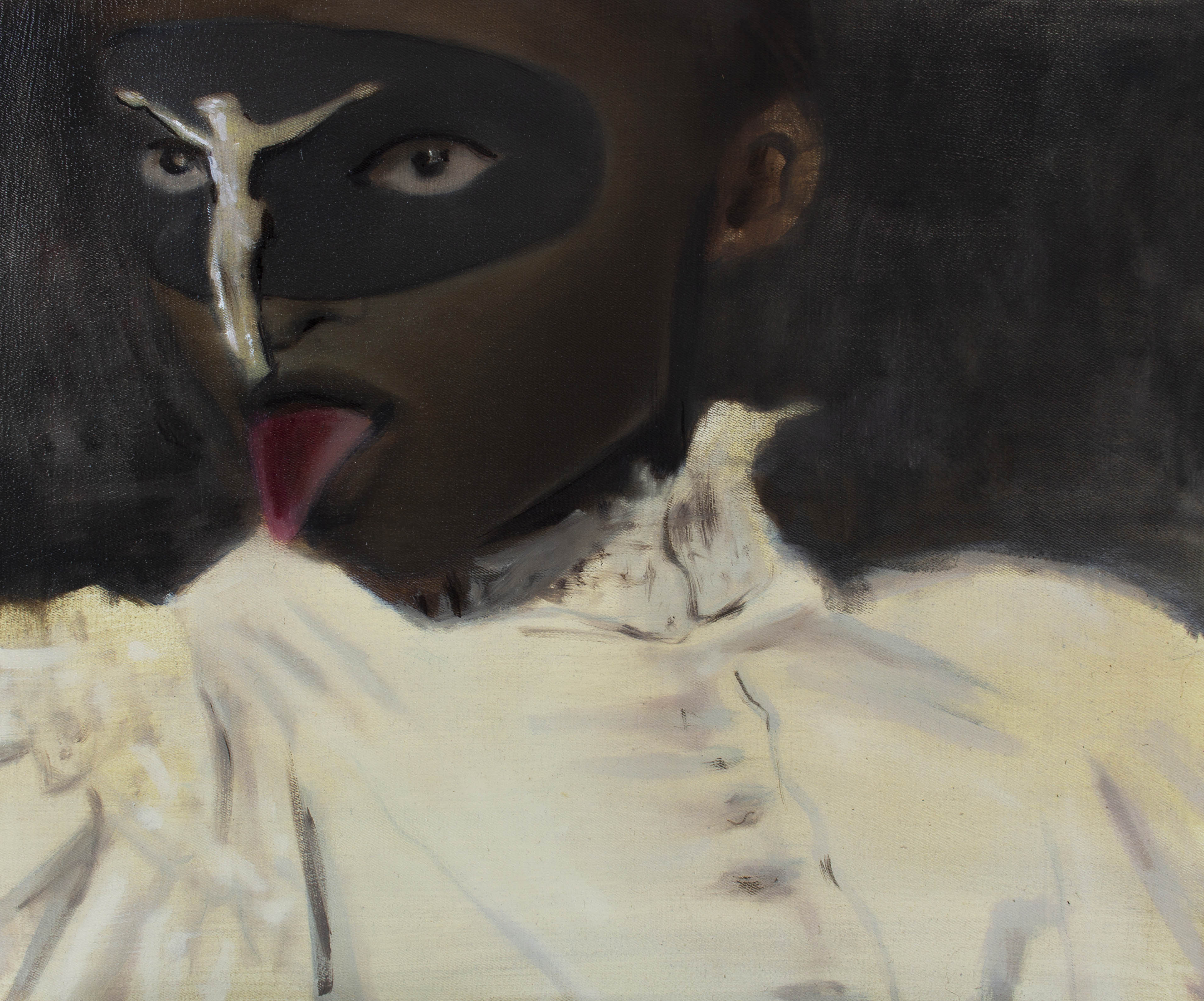 „Obraz stanowi bezpośrednią interpretację pokazu Alexandra McQueena z 1996 roku. Kolekcja ,,Dante”, osadzona w przestrzeni kościoła, nawiązuje do ,,Boskiej Komedii” i wizji piekła, zestawiając sacrum z tym, co cielesne, mroczne i prowokacyjne. Choć od jego premiery minęły dekady, wciąż budzi emocje i pozostaje jednym z najbardziej kontrowersyjnych momentów w historii mody. Chrześcijańska ikonografia stanowiła wyraźny punkt odniesienia w twórczości McQueena. To także stąd wywodzą się tajemnicze, często nacechowane spiskowo teorie o rzekomych związkach projektanta z okultyzmem i satanizmem. Zdecydowałam się sportretować ikoniczną maskę z krucyfiksem, która pojawiła się w tym pokazie jako symbol tej osobliwej mieszanki duchowości, erotyzmu, głębokiego znaczenia i niepokoju
