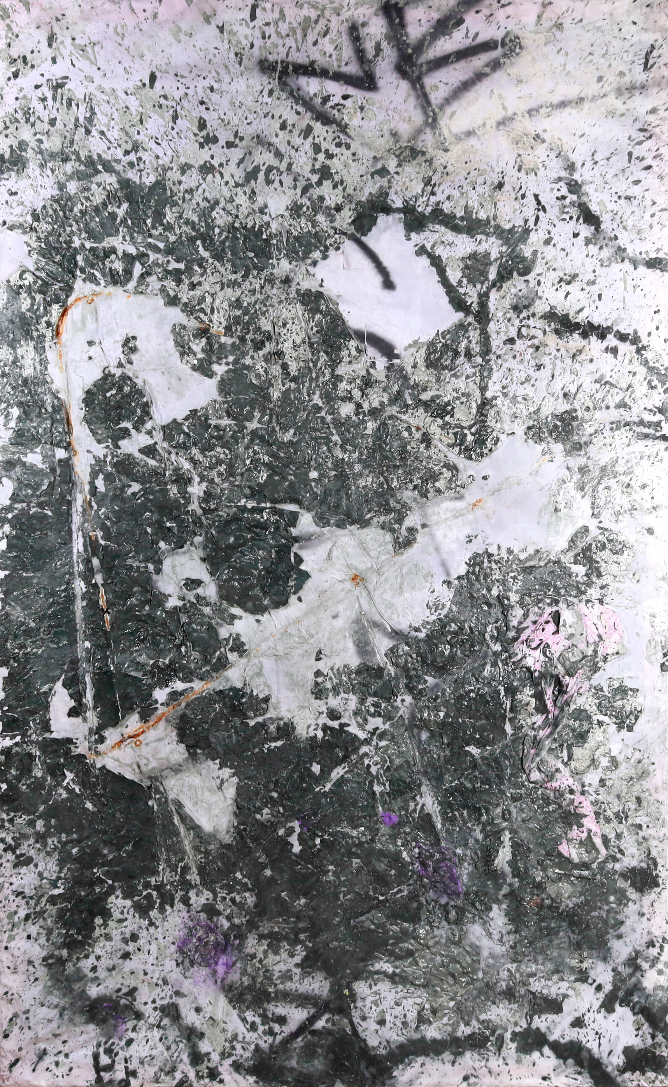 technika mieszana (akryl, spray, pigmenty, gips), płótno, 120 x 200 cm,