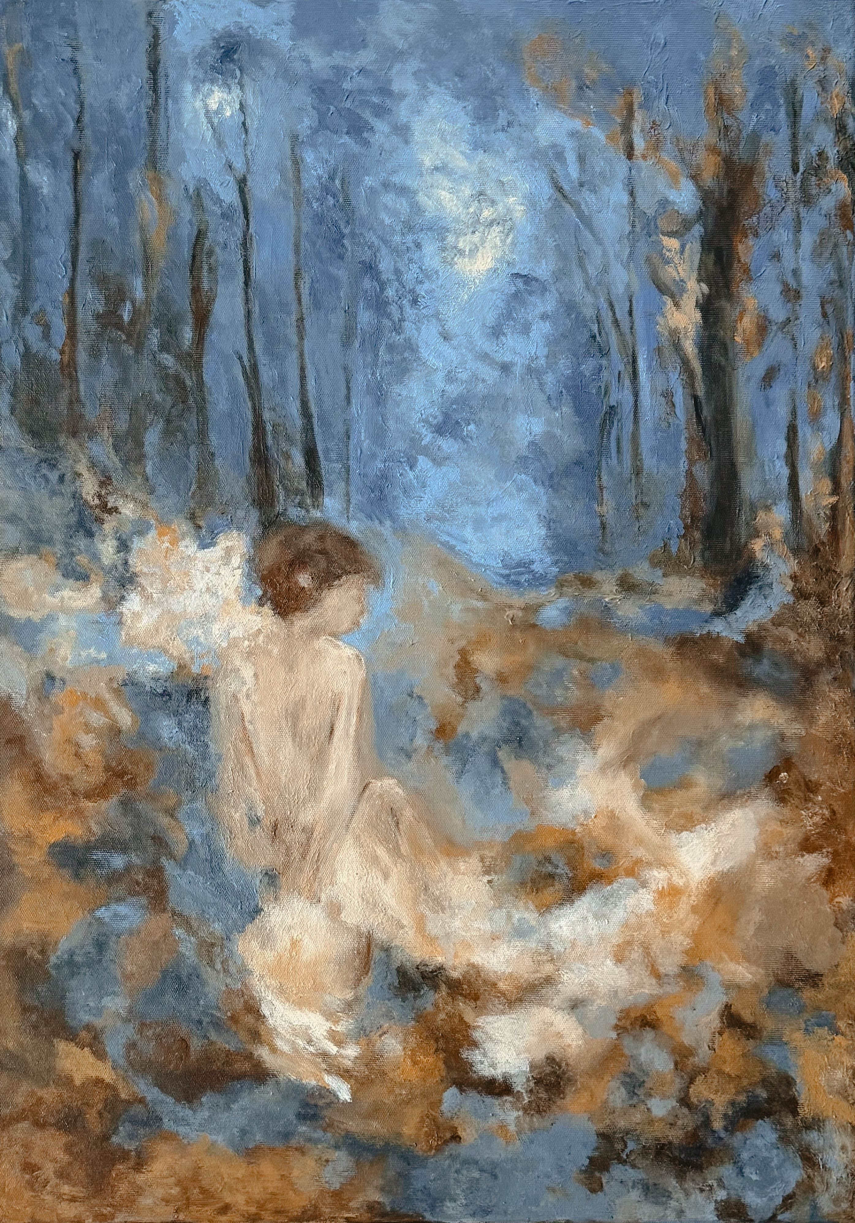 Operując wyciszoną, ziemistą paletą oraz warstwową materią farby, buduje kompozycje oparte na świetle i napięciu między obecnością a zanikiem. Rozwija autorskie cykle malarskie wokół tematów pamięci, tożsamości i materialności obrazu.