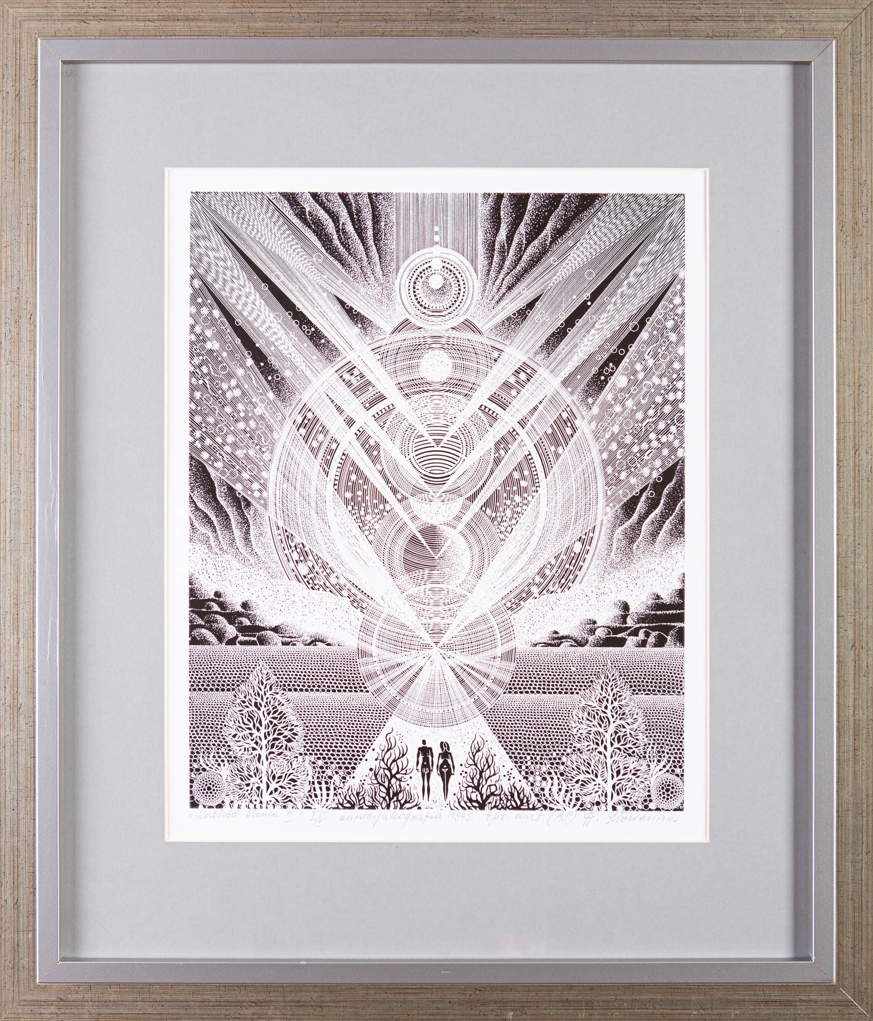 sygn., dat., opisana u dołu: „Zachód słońca II” I/VI. autocynkografia 1975 Ept. dart. (A.P.) H. Płóciennik; ed. 2/6