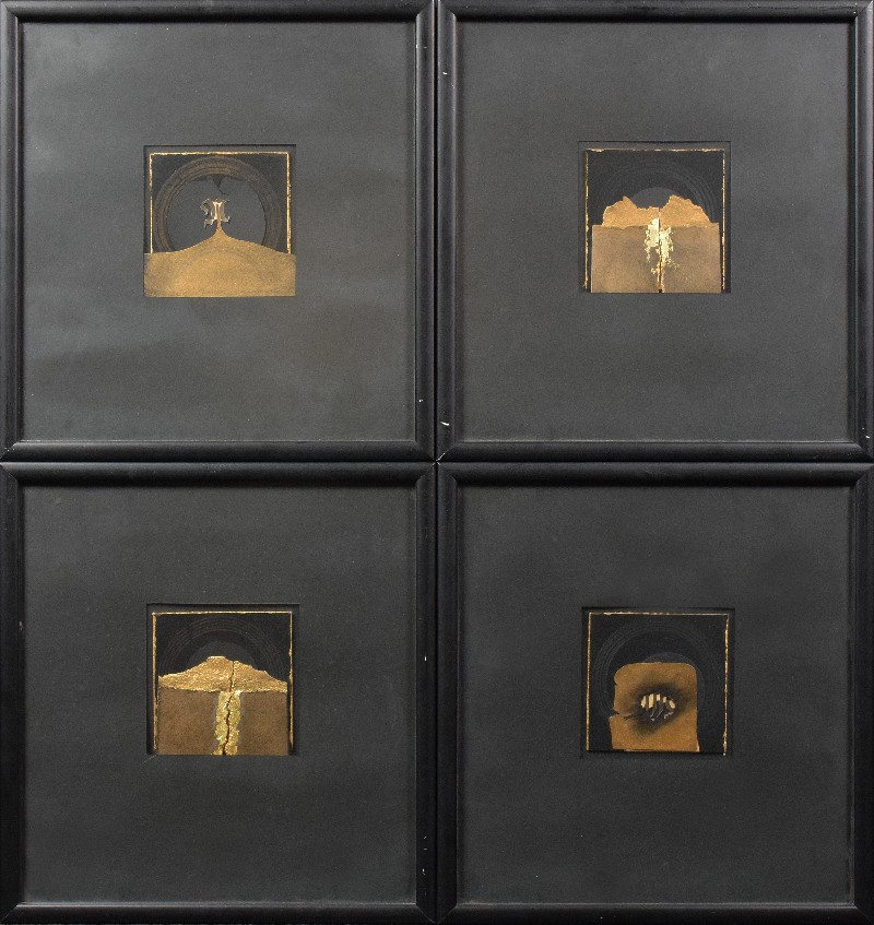 papier; tektura, płatki złota, technika własna; 37 x 35 cm (wymiar w oprawie);