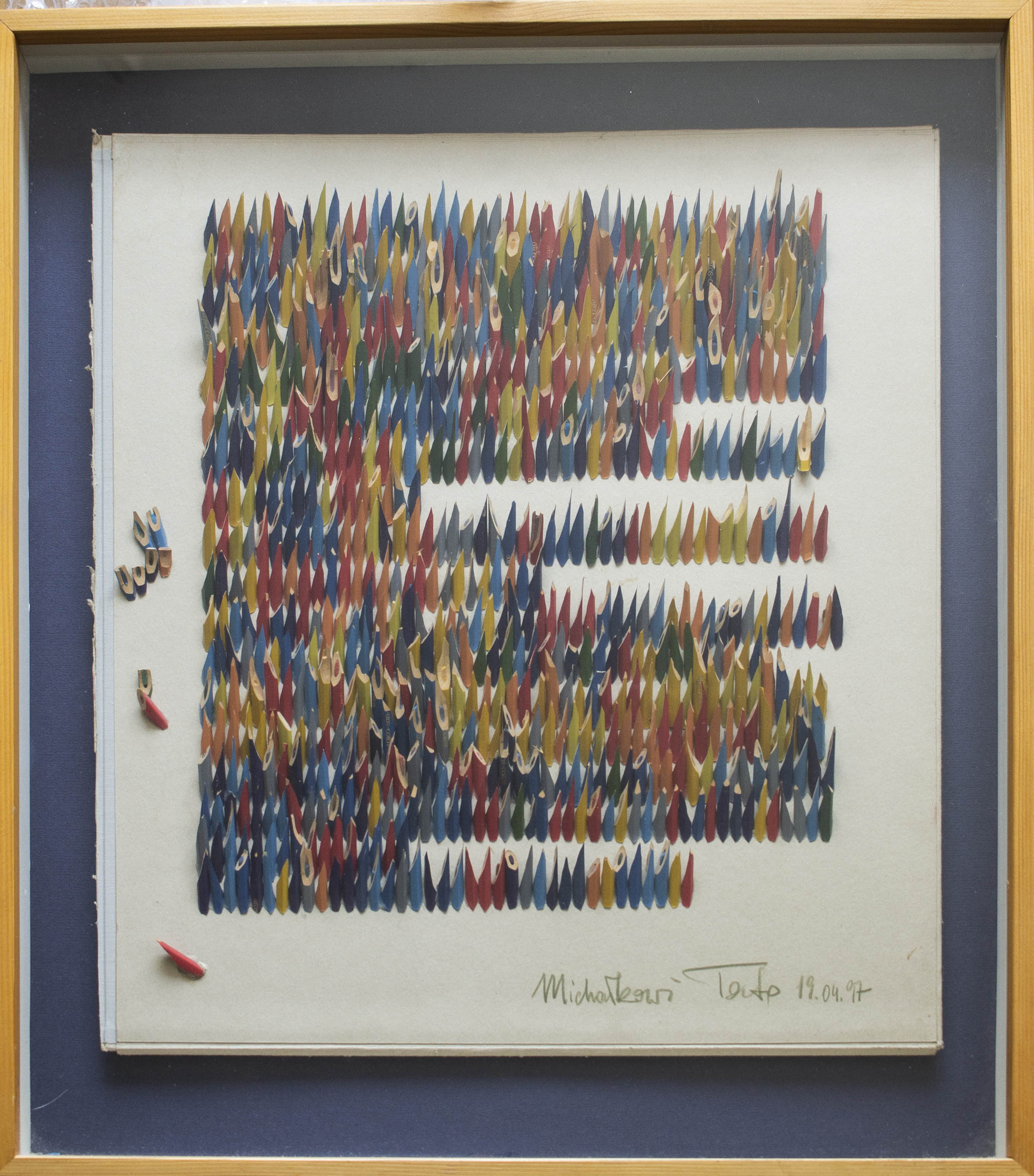 technika własna (kredki), wym. 52 x 46 cm, opr. 67 x 58,5 cm, op. p.d. 'Michałkowi Tato 19.04.97'