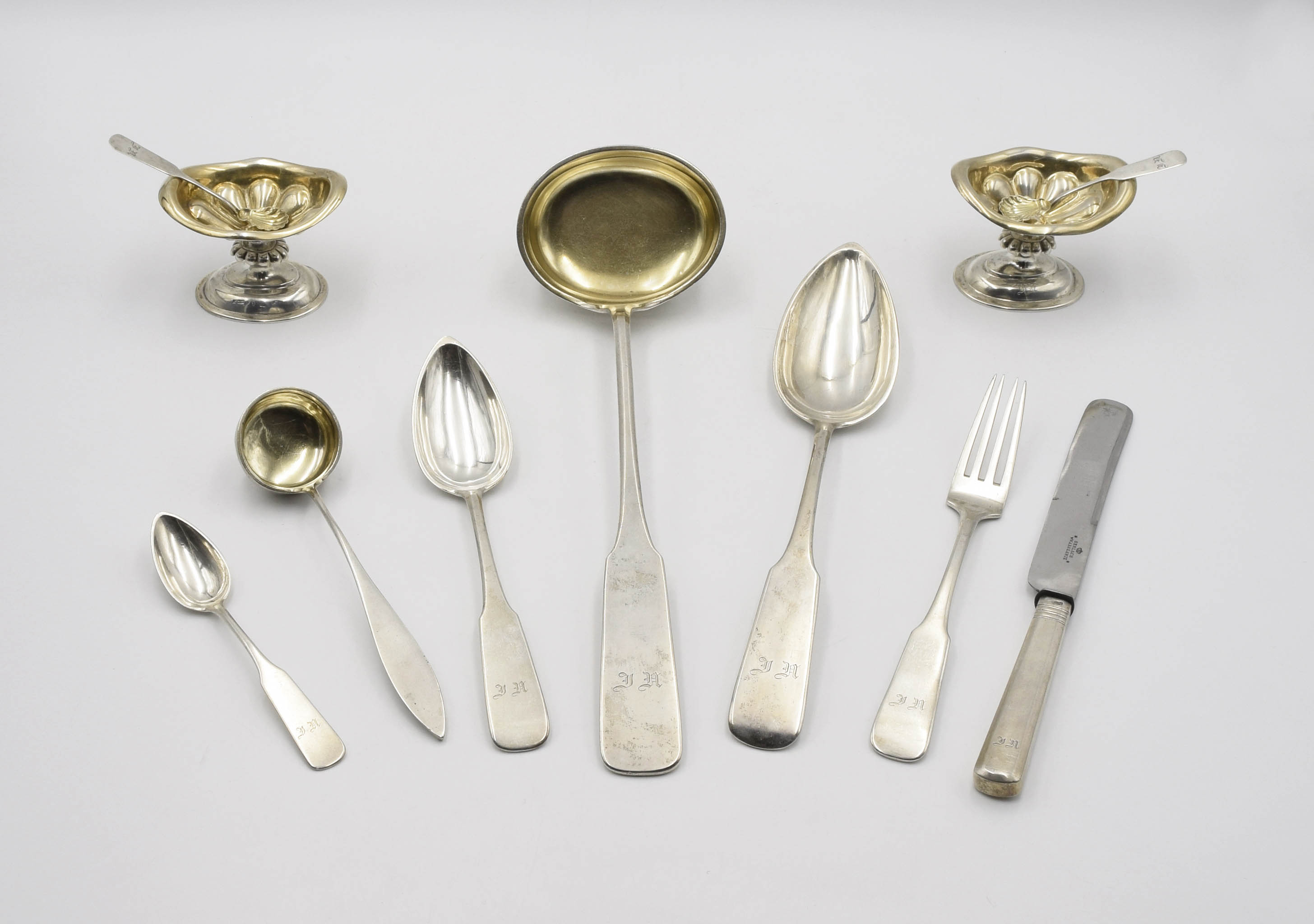 Sztućce z trzonkami łopatkowymi, z monogramami grawerowanymi w manierze gotyckiej, ostrza noży stalowe cechowane [korona] / GERLACH /w WARSZAWIE; trzonki noży dociążone; solniczki na owalnych stopach z trzonkiem z puklowanym kapturkiem, z czarkami o nieregularnej krawędzi, złoconymi, z puklowanym dnem. W kantynie.