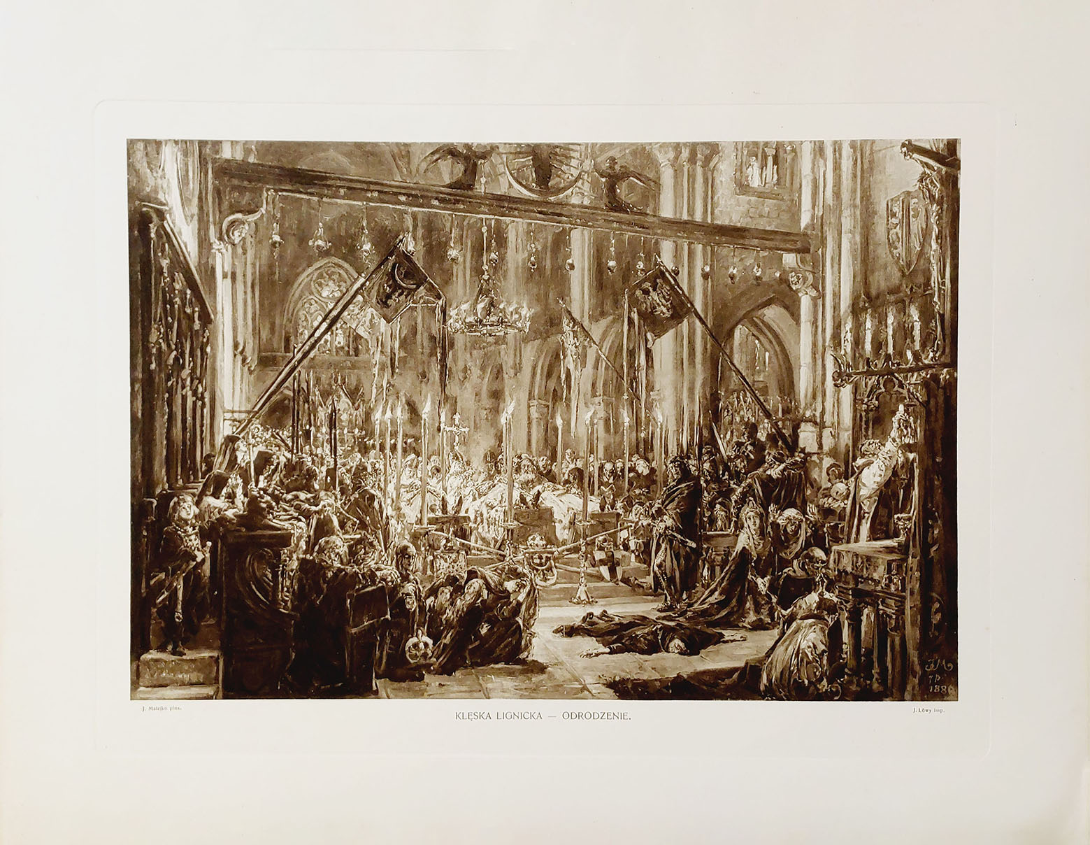 heliograwiura (widoczny odcisk płyty), papier;38 cm x 25,5 cm (wymiar kompozycji); 50 cm x 38 cm (wymiar arkusza)praca opisana drukiem u dołu l. d.: J.Matejko pinx.,p. d.: J.Löwy imp.,tytuł po środku u dołu: KLĘSKA LIGNICKA - ODRODZENIE