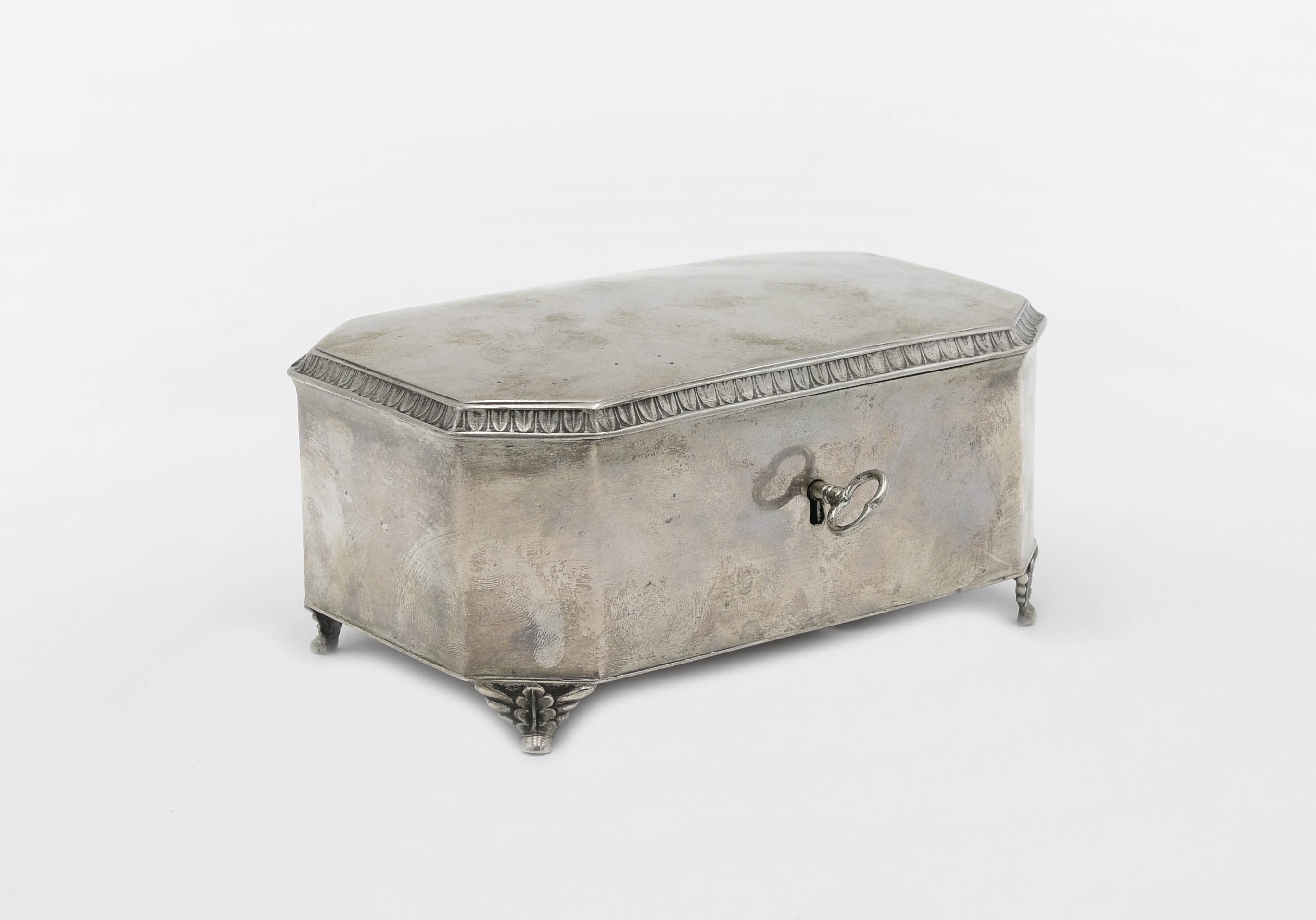 Wsparta na czterech nóżkach zdobionymi liśćmi akantu, prostopadłościenna, ze ściętymi narożami, gładka, od frontu otwór na kluczyk; nakrywka na zawiasie, uniesiona, obrzeżona moletowanym kimationem.