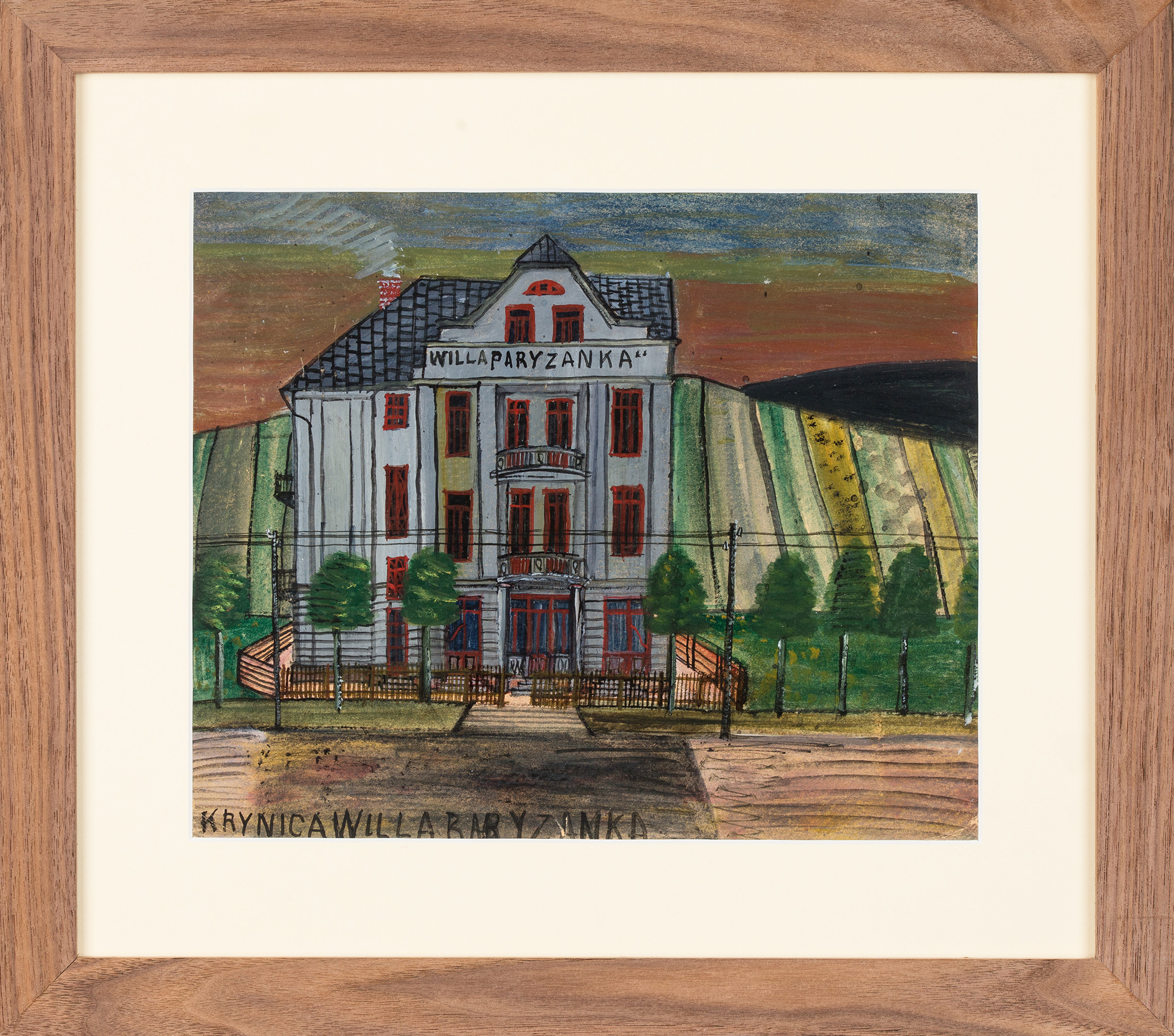 akwarela, gwasz na papierze, 24 x 27 cm, opisany autorsko u dołu kompozycji: "KRYNICAWILLARARYZANKA".