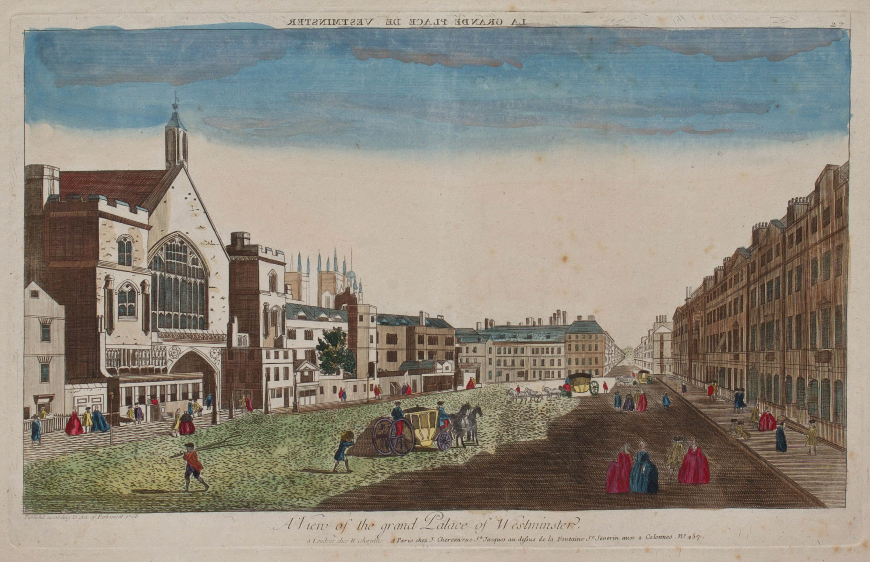 Widok na Pałac Westminsterski, XVIII w.miedzioryt kolorowany, 25,5 x 41 cm (odcisk płyty)stan zachowania: zaplamienia papieru, zagięcia na brzegach