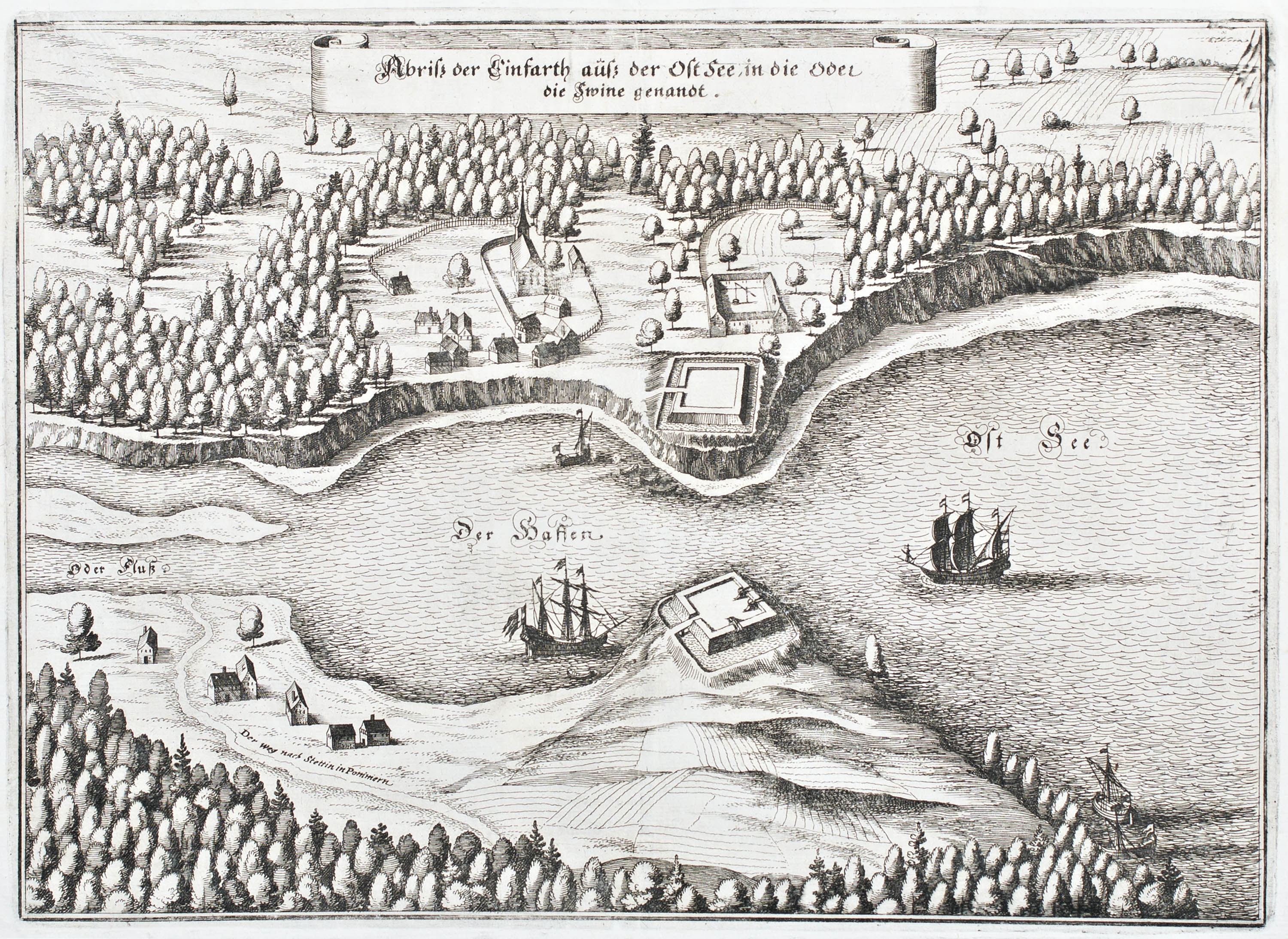 Widok Świnoujścia, pochodzący z dzieła „Theatrum Europeanum”, Frankfurt n. Menem, ok. 1645miedzioryt, wym. 25,2 x 34,5 cm (odcisk płyty), w oprawie