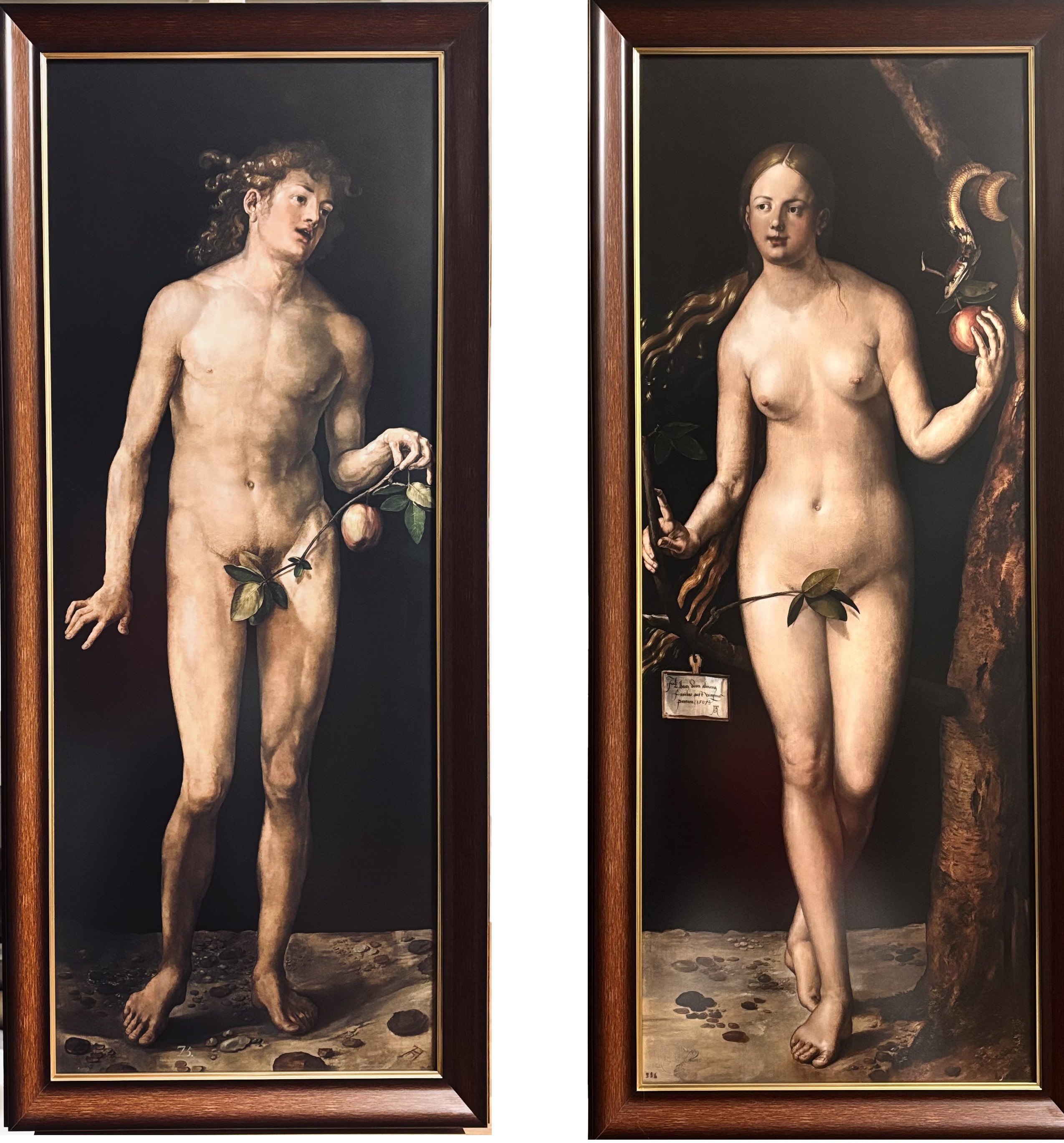 Na gałązce trzymanej przez Ewę w obrazie z 1507 roku rzeczywiście wisi tabliczka, na której znajduje się sygnatura Albrechta Dürera oraz data "1507". To ważny element tych obrazów, charakterystyczny dla wielu dzieł Dürera. Umieszczenie sygnatury w tak widocznym miejscu podkreślało jego status artysty i świadomość własnej wartości.