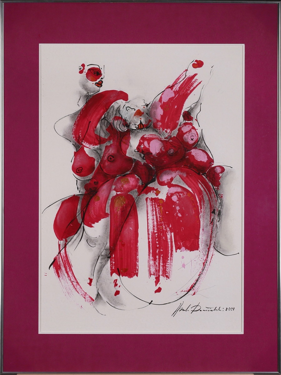technika mieszana (akryl, tempera, piórko, węgiel, tusz), karton, 62,5 x 43,5 cm (w świetle oprawy), w oprawie: 80 x 60 cm,