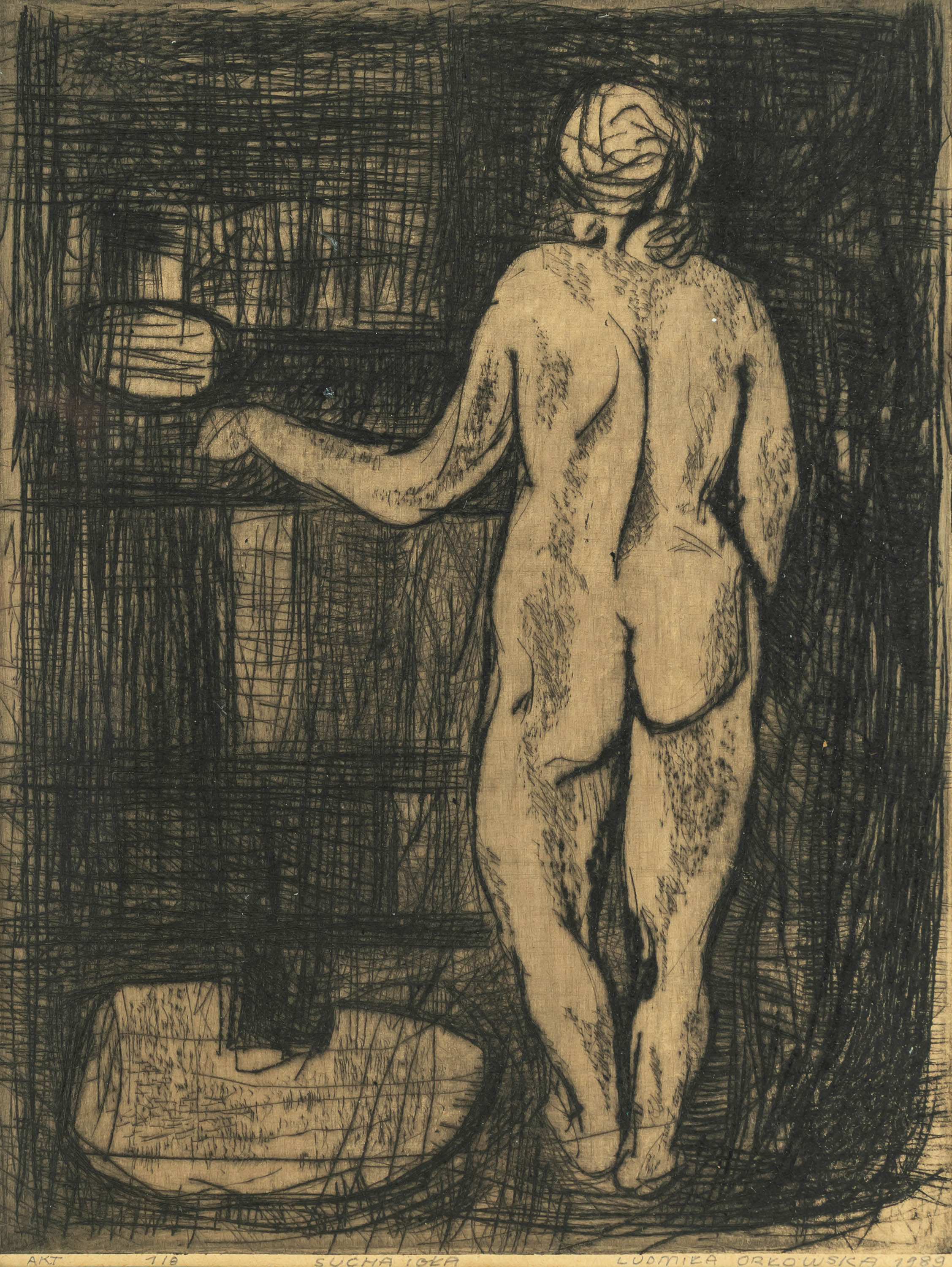 sucha igła, papier, 28 x 20,8 cm (odcisk i kompozycja), 38,5 x 27,5 cm (papier), wymiary z ramą: 55 x 40,5 cm, opisany ołówkiem l.d.: AKT 1/8, śr.d.: SUCHA IGŁA, sygn. i dat. p.d.: LUDMIŁA ORŁOWSKA 1989