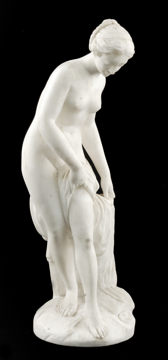 Rzeźba inspirowana znanymi od starożytności wizerunkami Afrodyty - Wenus (np. Afrodyty z Knidos Praksytelesa). Niesygnowana. Ślad klejenia na szyi.