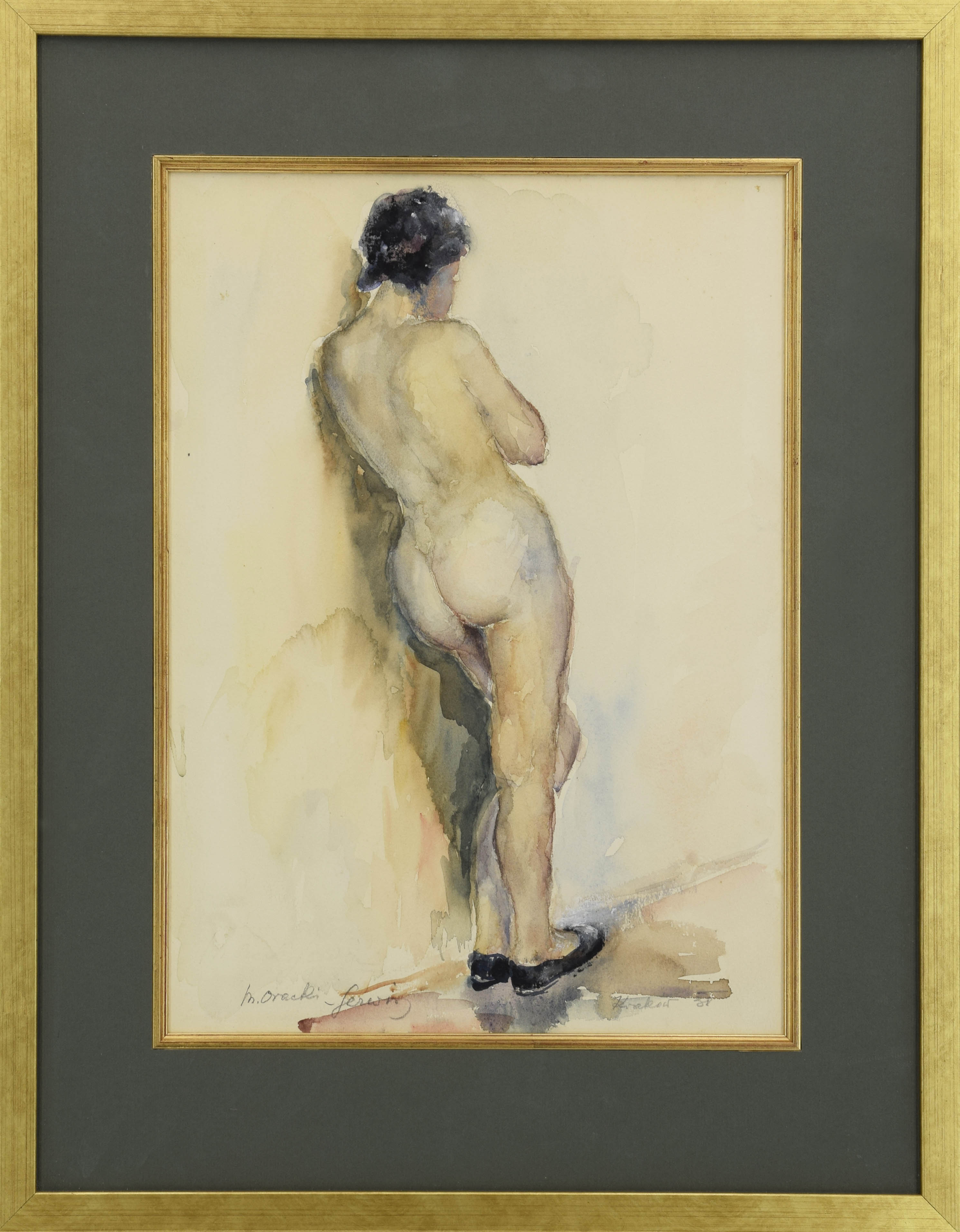 akwarela na podrysowaniu ołówkiem, papier; 33,5 x 24 cm (w świetle oprawy);sygn. l. d.: M. Oracki-Serwin (ołówkiem);napis p. d.: Kraków 38 (ołówkiem).