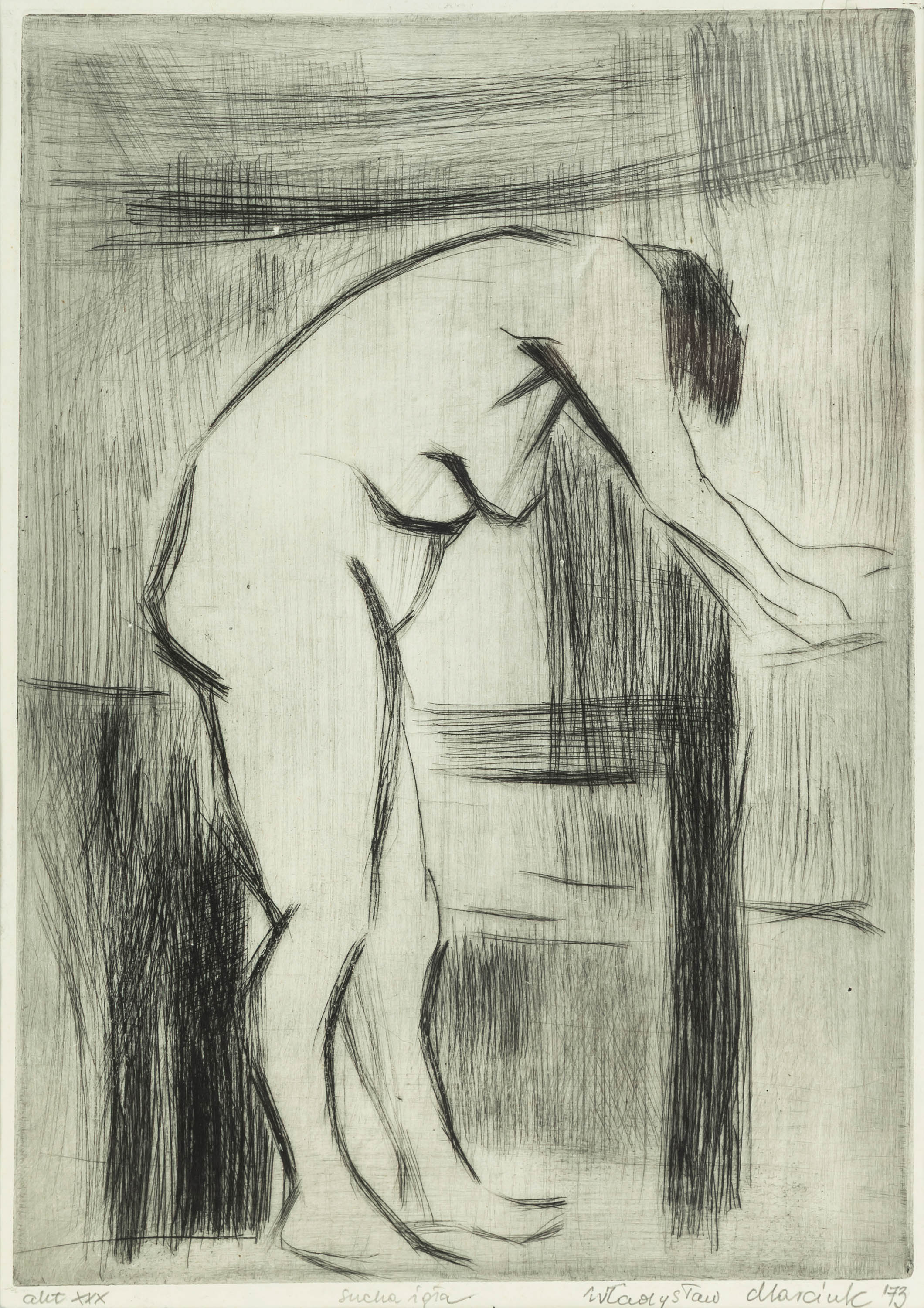 sucha igła, papier, 29 x 20 cm (odcisk i kompozycja), 34 x 24,5 cm (papier), opisany ołówkiem l.d.: akt XXX, śr.d.: sucha igła,
