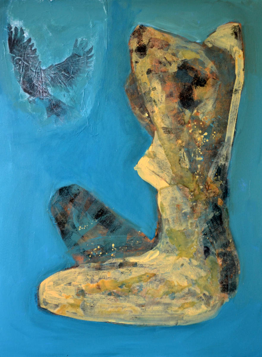 technika mieszana, kolaż, akryl na płótnie, 80x60 cmSygnowany z przodu, lewy dolny róg i opisany na odwrocie: Anna M. Masiul-Gozdecka 2014 Akt z gołębiem