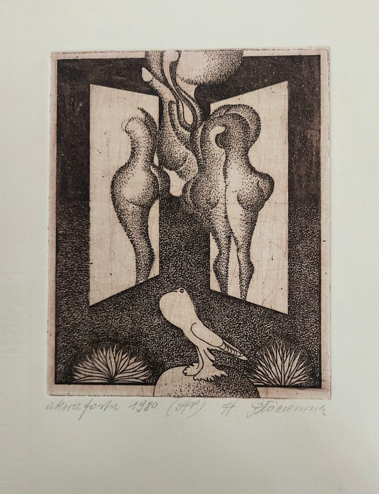 Wymiary kompozycji: 14,5 x 12 cmWymiary arkusza: 25,5 x 18,5 cmSygn. H. PŁÓCIENNIKUnikatowa akwaforta w twórczości Henryka Płóciennika