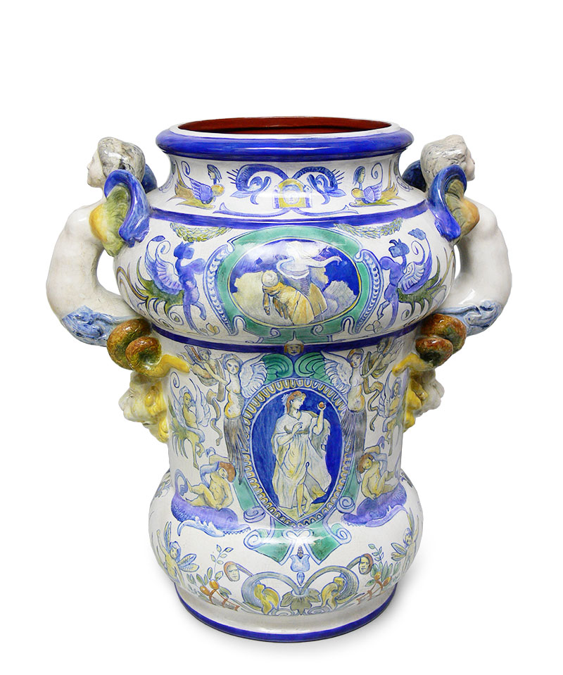 majolika, odlew z formy, szkliwa barwne, kryjące, dekoracja w postaci motywów groteskowych, rogów obfitości, girland i kartuszy z personifikacjami cnót; sygn. na spodzie: CADINEN; wys. 52,5 cm, śred. wylewu 26 cm