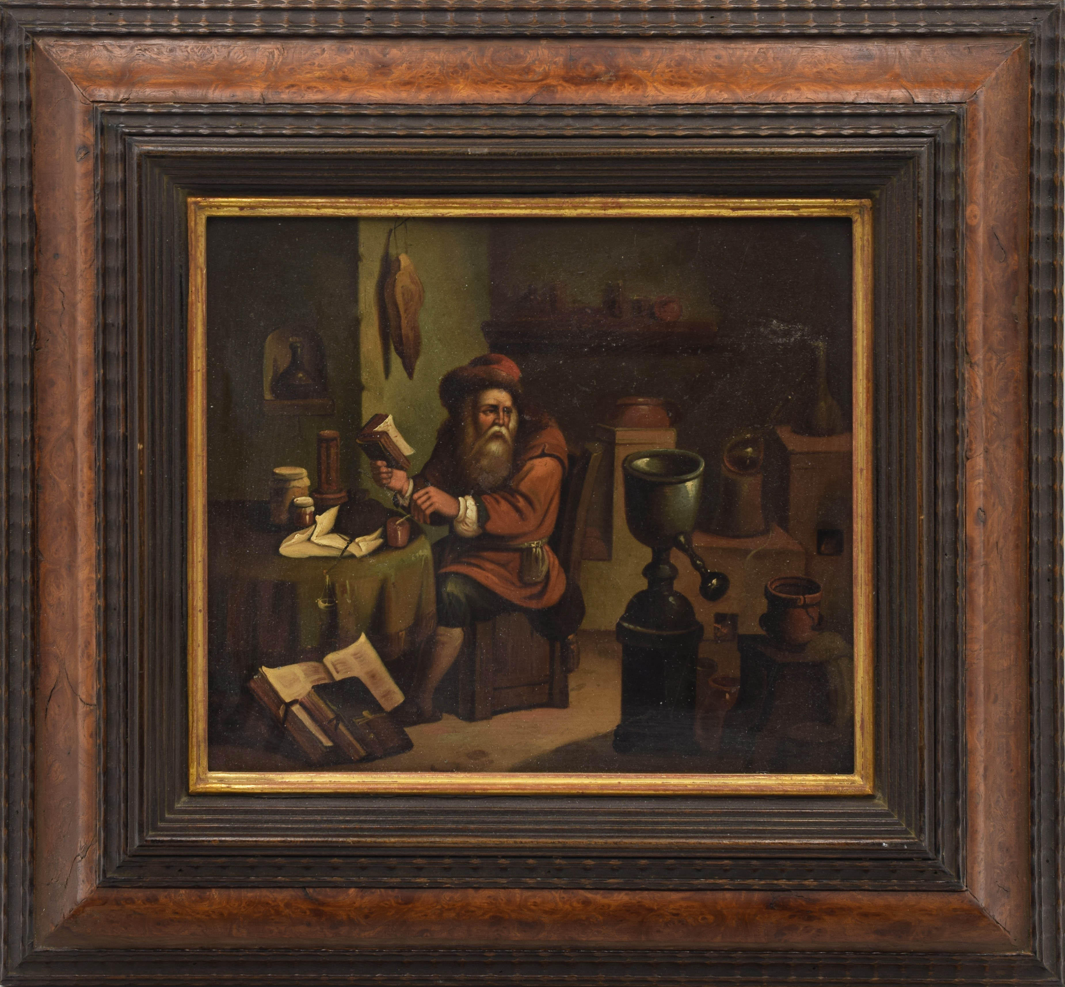 olej , blacha; 20 x 23,5 cm; rama 36 x 39 cm; na odwrocie papierowa nalepka z drukowanym napisem wypełniona odręcznie: Genre-Bild, / … / Grand No 5 / Sujet No 134. Według Davida TENIERSA młodszego (1610-1690).