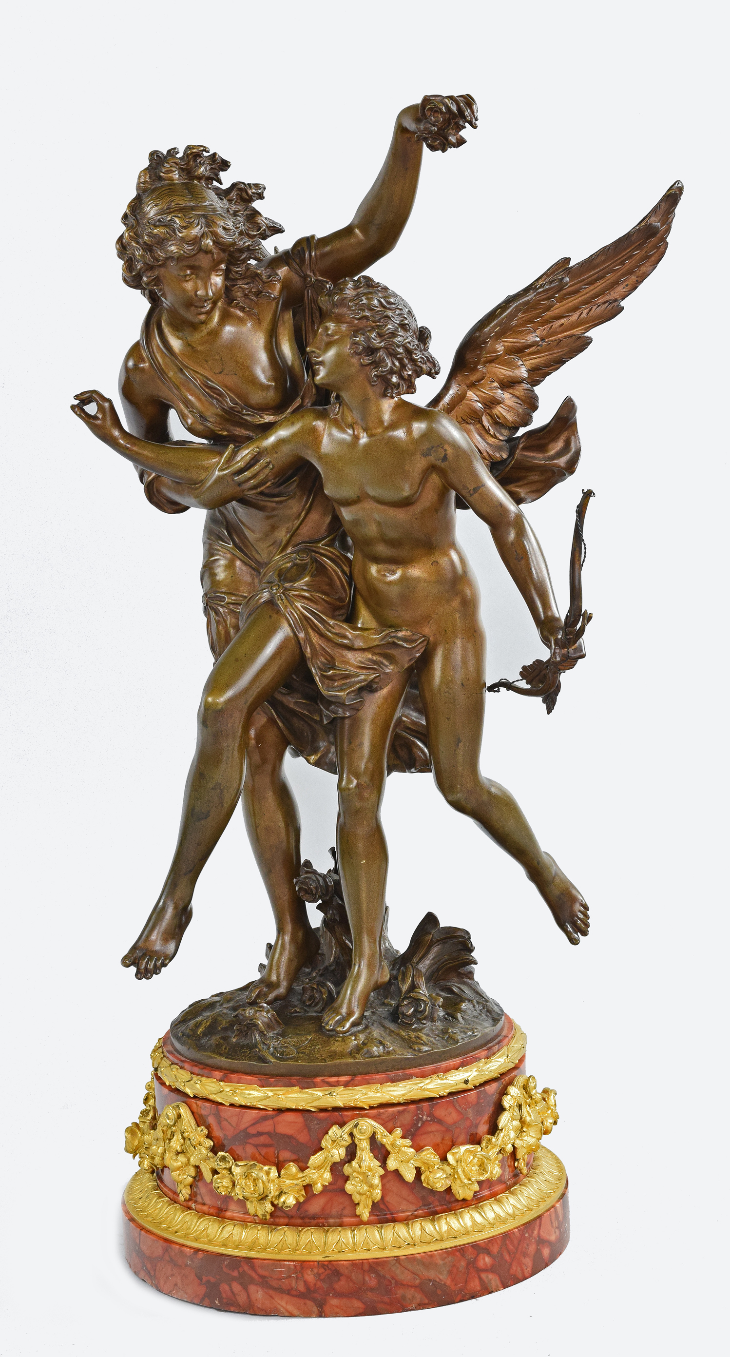 Grupa rzeźbiarska z dwiema, obejmującymi się, uchwyconymi w szybkim biegu postaciami: nagi, skrzydlaty Amor z łukiem i strzałą w lewej ręce oraz Psyche w przylegającej do ciała szacie odsłaniającej piersi, obsypująca kochanka różanymi kwiatami. Z tyłu na podstawie sygnatura: „Ferville Suane”. Całość na cylindrycznym cokole dwustopniowym: szerszy krąg dolny oddzielony od górnego gzymsem palmetowym z brązu złoconego; na górnym - aplikacja z plastycznych girland różanych i opaska ze złoconego lauru.