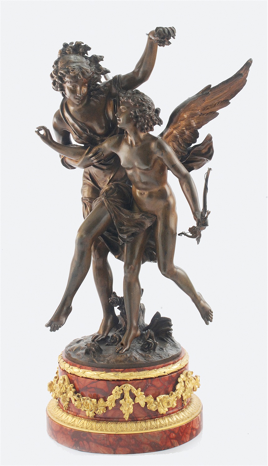 Grupa rzeźbiarska z dwiema, obejmującymi się, uchwyconymi w szybkim biegu postaciami: nagi, skrzydlaty Amor z łukiem i strzałą w prawej ręce oraz Psyche w przylegającej do ciała szacie odsłaniającej piersi, obsypująca kochanka różanymi kwiatami. Z tyłu na podstawie sygnatura: "Ferville Suane". Całość na cylindrycznym cokole dwustopniowym: szerszy krąg dolny oddzielony od górnego gzymsem palmetowym z brązu złoconego; na górnym - aplikacja z plastycznych girland różanych i opaska ze złoconego lauru.