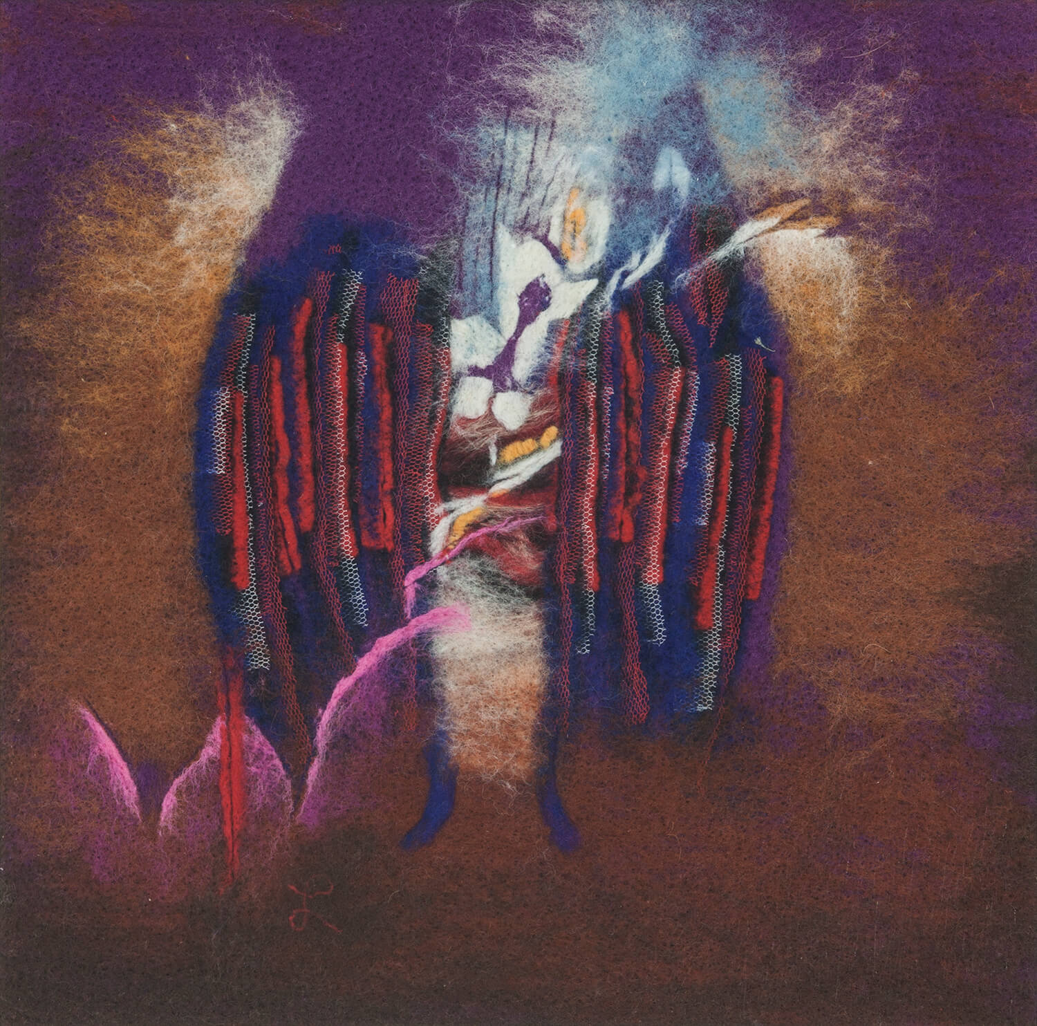 obraz włókienniczy, kolaż tkanin, 26,8 x 26,8 cm (w świetle passe-partout). Oprawiony, passepartout, rama aluminiowa ok. 45,5 x 43,2 cm.