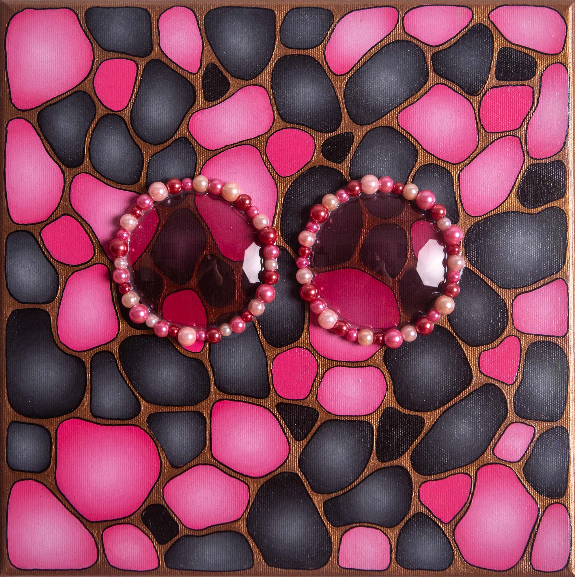 Akryl, marker, obiektywy, szklane koraliki; 30 x 30 cm