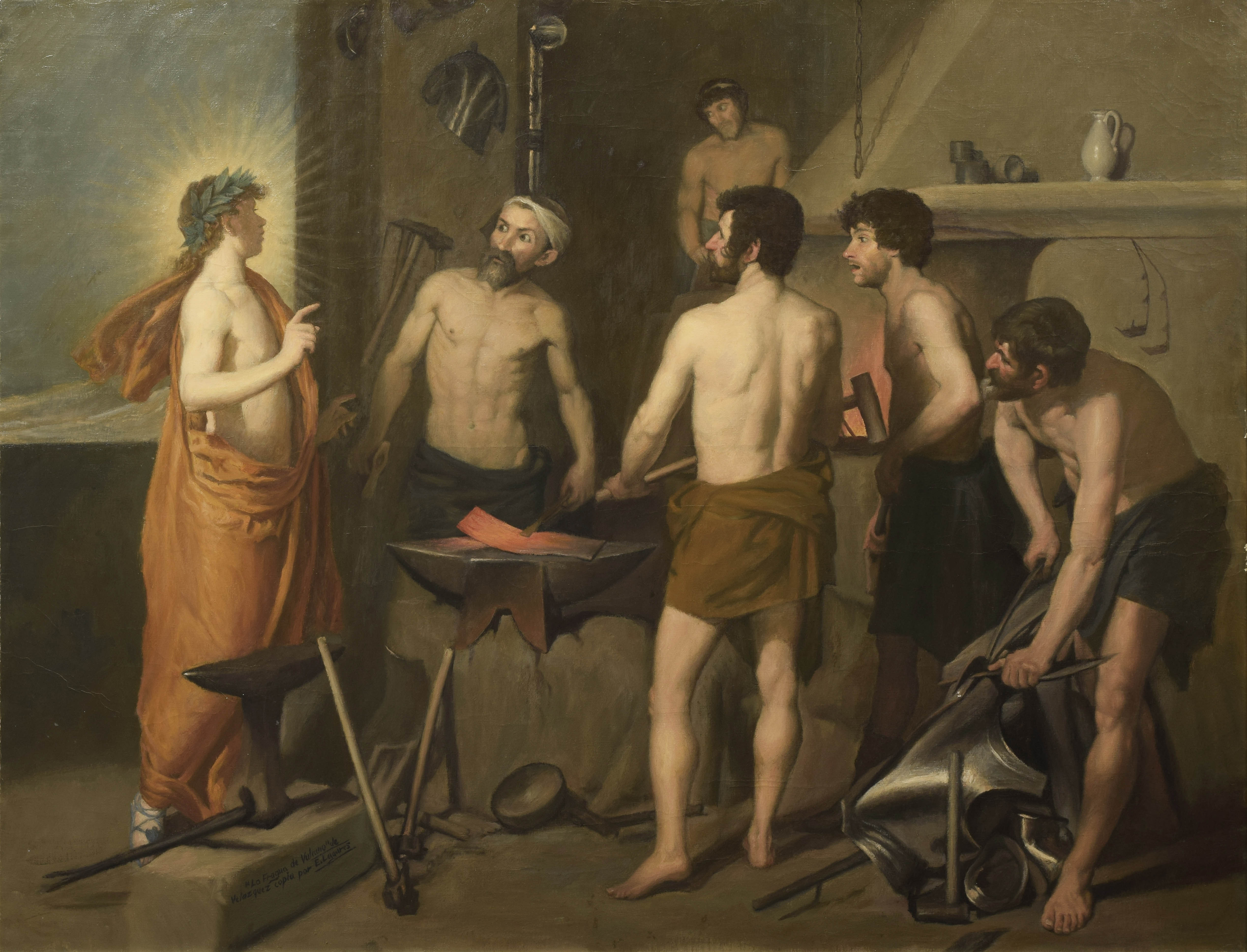 kopia według: Diego Rodríguez de Silva y VELÁZQUEZ (ok. 1599-1660) olej, płótno;107 x 139 cm; l. d. napis: "La Fraqua de Vuleano" de Velazquez copia por E. Lagares. Stan zach.: liczne odpryski malatury przy oprawie, po prawej.