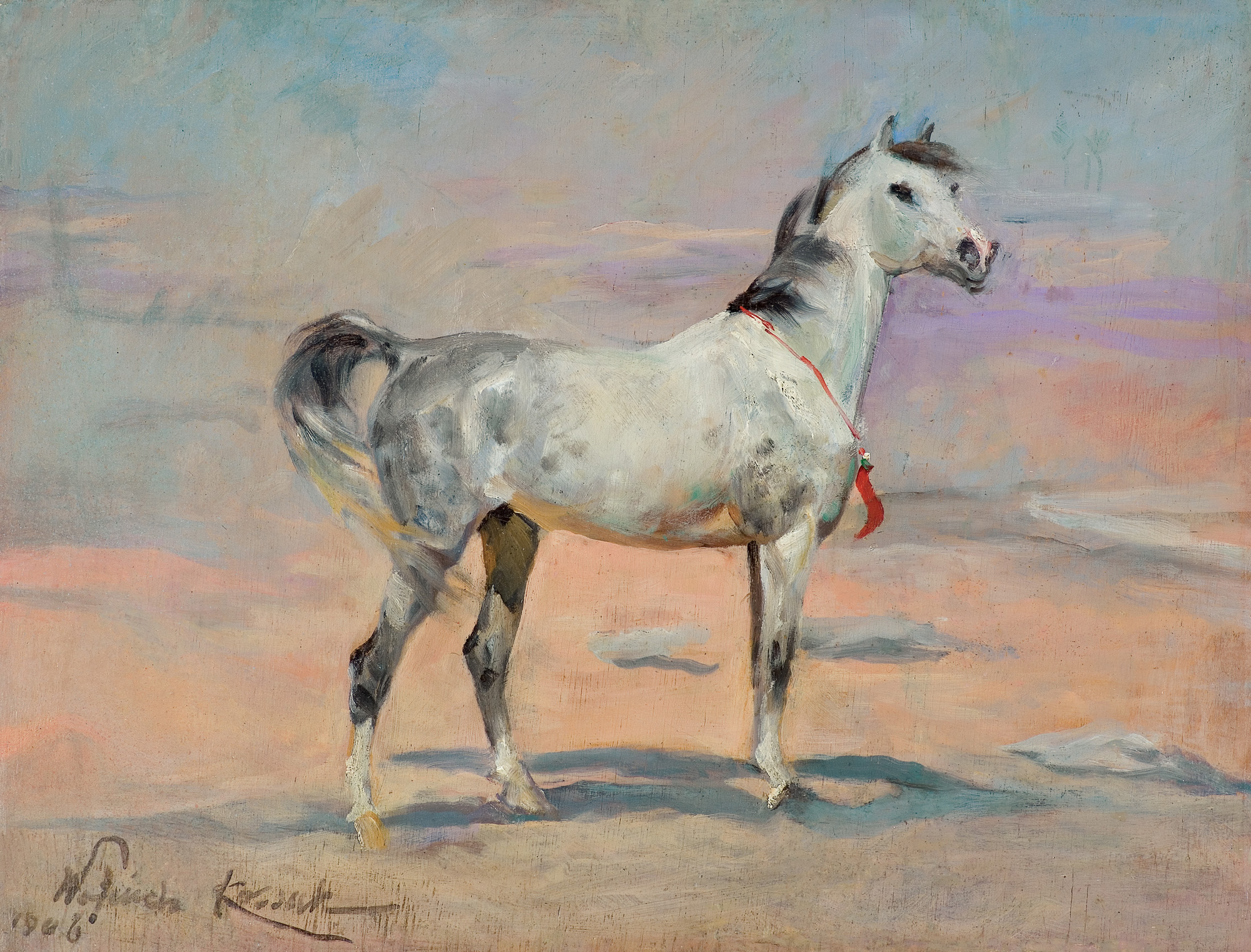 Wojciech Kossak (Paryż 1856 - Kraków 1942 ) – powszechnie znany malarz, postrzegany przede wszystkim jako świetny batalista. Syn i uczeń Juliusza Kossaka kształcił się w krakowskiej Szkole Sztuk Pięknych, w Akademii monachijskiej oraz w Paryżu. W latach 1895-1902 przebywał głównie w Berlinie, pracując dla cesarza Wilhelma II. Wiele podróżował, m.in. do Hiszpanii i Egiptu, gdzie wykonywał szkice do zamierzonych panoram. W późniejszych latach kilkakrotnie wyjeżdżał do Stanów Zjednoczonych wykonując zamówienia portretowe. W 1913 był mianowany profesorem warszawskiej Szkoły Sztuk Pięknych. W latach I wojny światowej pełnił służbę wojskową. Był współautorem panoram: „Racławice” (1893-1894), „Berezyna” (1895-1896), „Bitwa pod piramidami” (1901) oraz szkiców do niezrealizowanej „Somosierry” (1900). Z temperamentem i swobodą tworzył szeroko malowane, dynamiczne sceny batalistyczne, historyczne, rodzajowe oraz liczne portrety. Z upodobaniem malował konie. Jego obrazy, gloryfikujące dawne i współczesne artyście polskie wojsko i bohaterstwo żołnierzy, trafiały do patriotycznych uczuć odbiorców i cieszyły się ogromna popularnością.