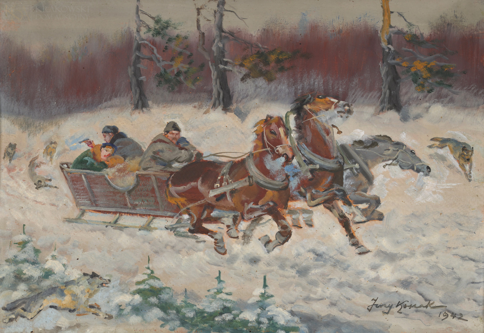 olej, tektura 35 x 50 cm; 47,5 x 63 cm (z oprawą) Sygn. i dat. p.d.: "Jerzy Kossak | 1942" Na odwrocie pieczątka Jerzego Kossaka z herbem rodu Kossaków oraz pieczątka artysty z potwierdzeniem autentyczności obrazu.