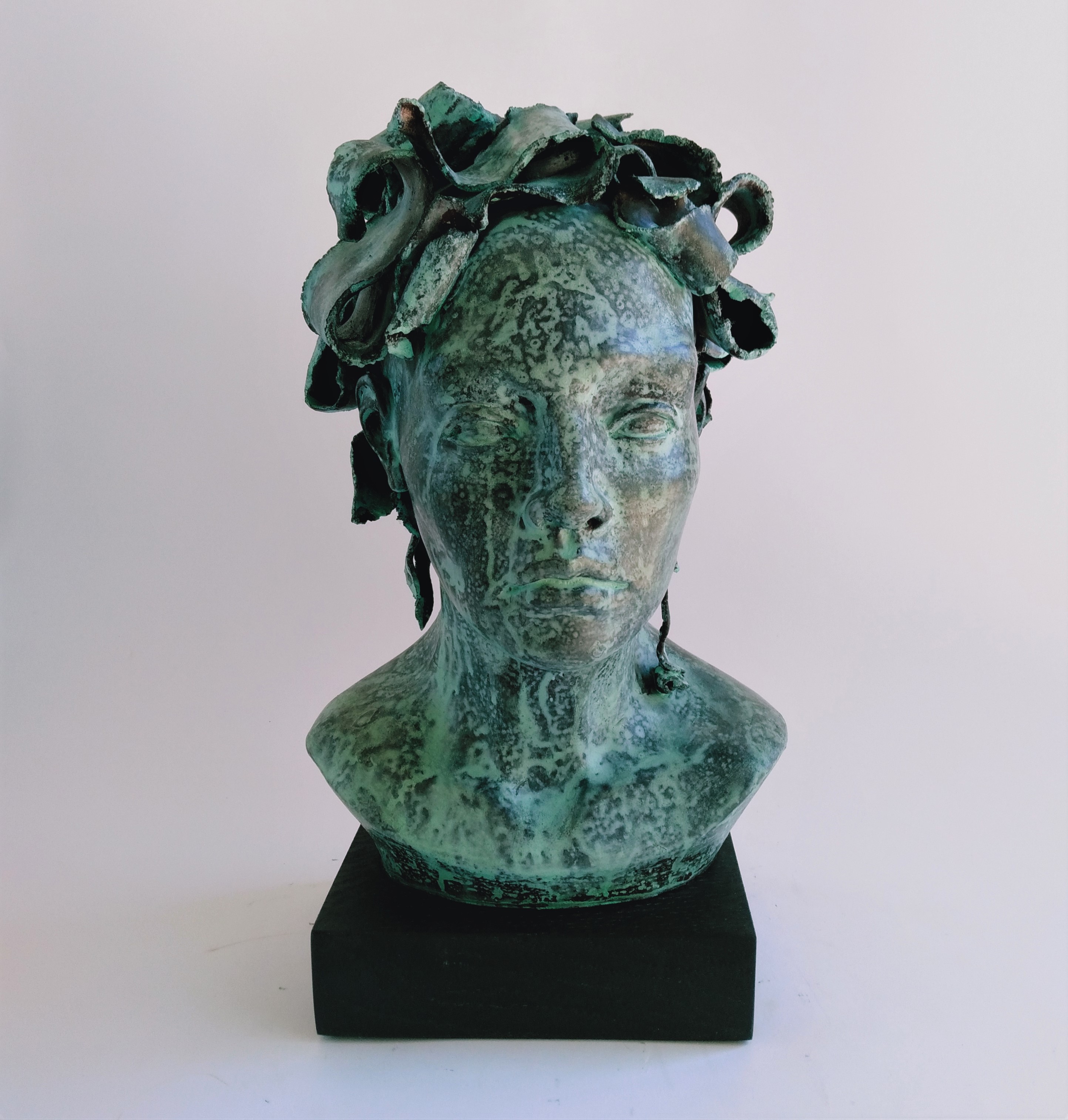 porcelana patynowana, drewniana podstawa, 32 x 18 x 18 cm,