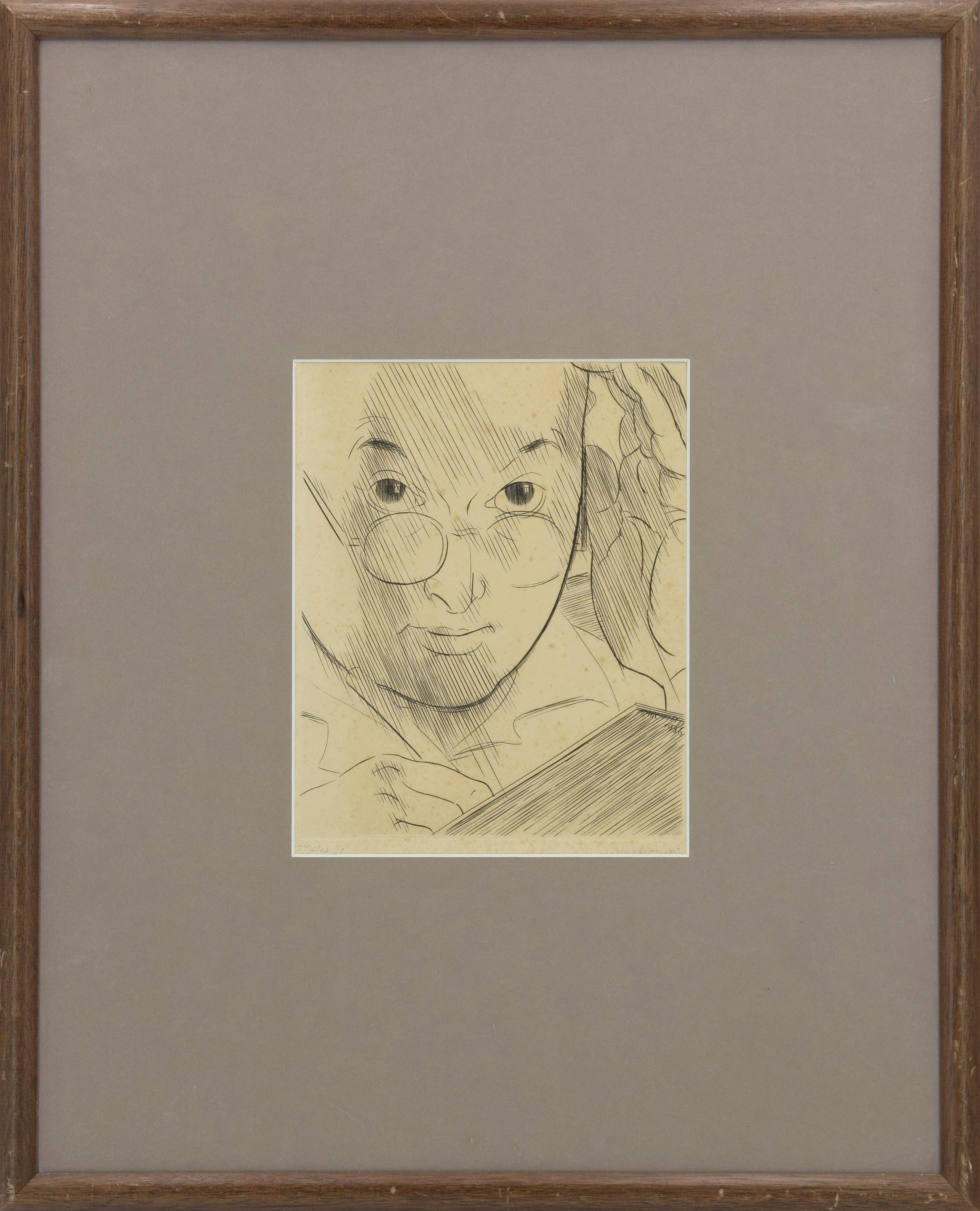 akwaforta papier; 21,5 x 17 cm (w świetle passe-partout); sygn. i dat. na płycie p. d.: marcoussis/ 1936; oraz na papierze p. d.: marcoussis (ołówkiem), l. d.: odbitka autorska 1/1. Stan zachowania: zaplamienie na całej powierzchni.