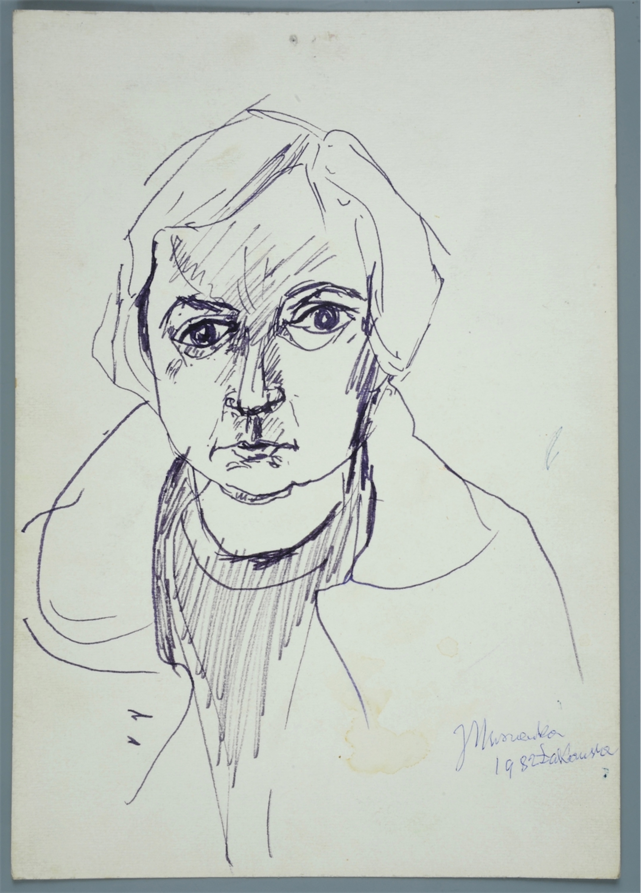 pisak czarny; karton;32,5 x 23 cm;sygnowana u dołu z prawej: JMuszanka / Łakomska / 1982 (długopisem).